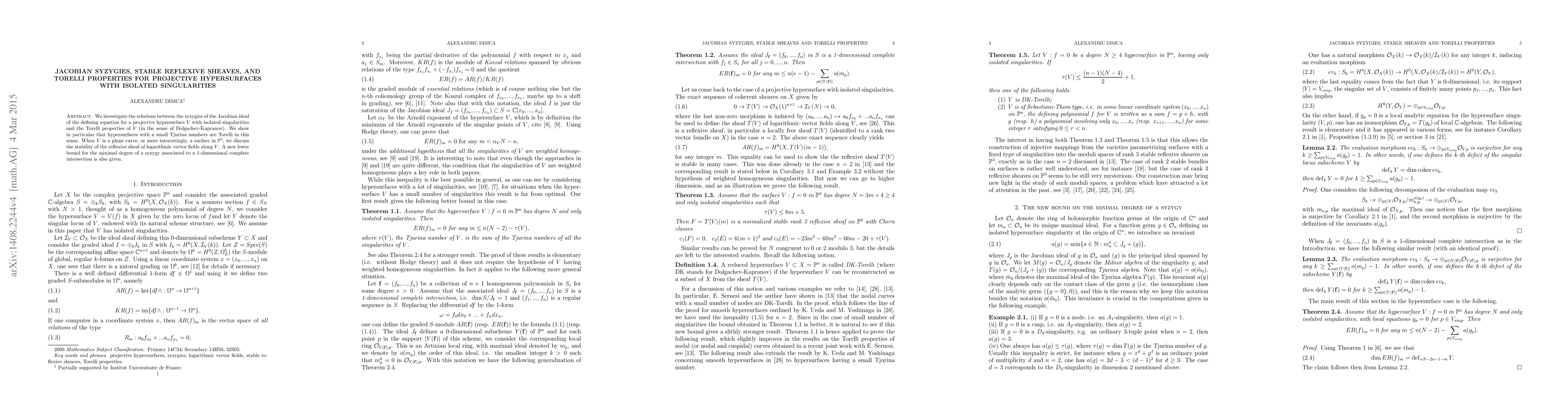 This paper explores the connections between Jacobian syzygies of projective hypersurfaces with isolated singularities and their Torelli properties. It demonstrates that hypersurfaces with small Tjurina numbers exhibit Torelli properties and discusses the stability of reflexive sheaves of logarithmic vector fields for plane curves and surfaces in projective space.