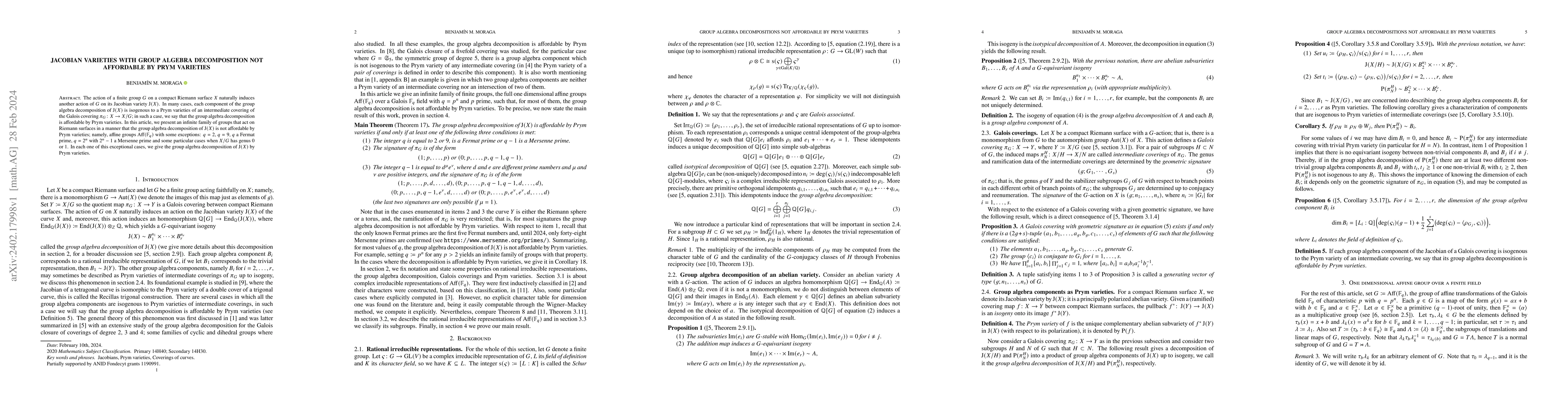 The action of a finite group $G$ on a compact Riemann surface $X$ naturally induces another action of $G$ on its Jacobian variety $\operatorname{J}(X)$. In many cases, each component of the group algebra decomposition of $\operatorname{J}(X)$ is isogenous to a Prym varieties of an intermediate covering of the Galois covering $\pi_G\colon X \to X/G$; in such a case, we say that the group algebra decomposition is affordable by Prym varieties. In this article, we present an infinite family of groups that act on Riemann surfaces in a manner that the group algebra decomposition of $\operatorname{J}(X)$ is not affordable by Prym varieties; namely, affine groups $\operatorname{Aff}(\mathbb{F}_q)$ with some exceptions: $q = 2$, $q = 9$, $q$ a Fermat prime, $q = 2^n$ with $2^n-1$ a Mersenne prime and some particular cases when $X/G$ has genus $0$ or $1$. In each one of this exceptional cases, we give the group algebra decomposition of $\operatorname{J}(X)$ by Prym varieties.