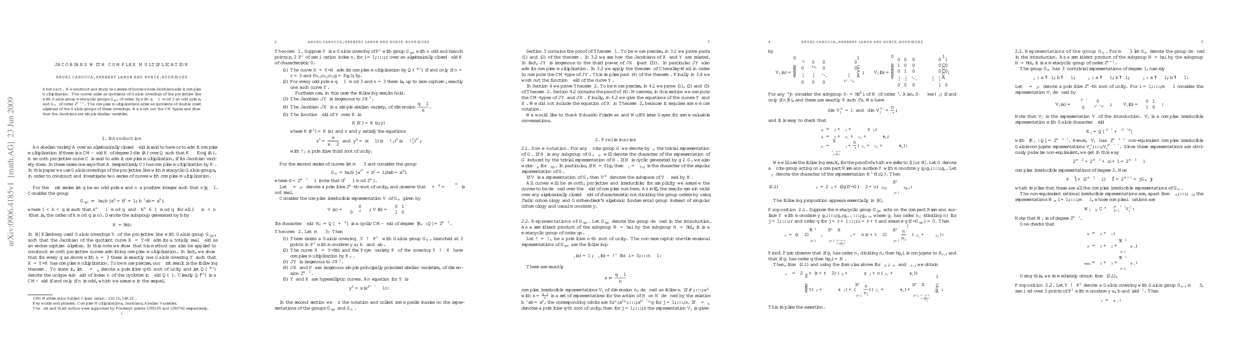 This paper constructs and studies two series of curves with Jacobians admitting complex multiplication, arising from Galois coverings of the projective line with metacyclic groups. The complex multiplications are derived from double coset algebras of the Galois groups, and the Jacobians are shown to be simple abelian varieties.