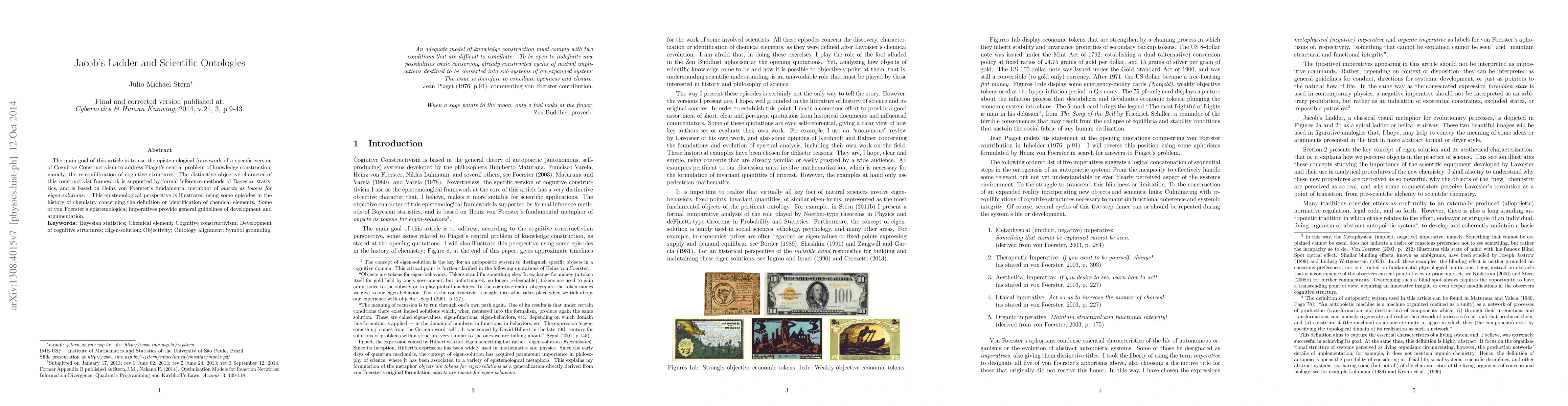 The main goal of this article is to use the epistemological framework of a specific version of Cognitive Constructivism to address Piaget's central problem of knowledge construction, namely, the re-equilibration of cognitive structures. The distinctive objective character of this constructivist framework is based on Heinz von Foerster's fundamental metaphor of - objects as tokens for eigen-solutions, and is also supported by formal inference methods of Bayesian statistics. This epistemological perspective is illustrated using some episodes in the history of chemistry concerning the definition or identification of chemical elements. Some of von Foerster's epistemological imperatives provide general guidelines of development and argumentation.