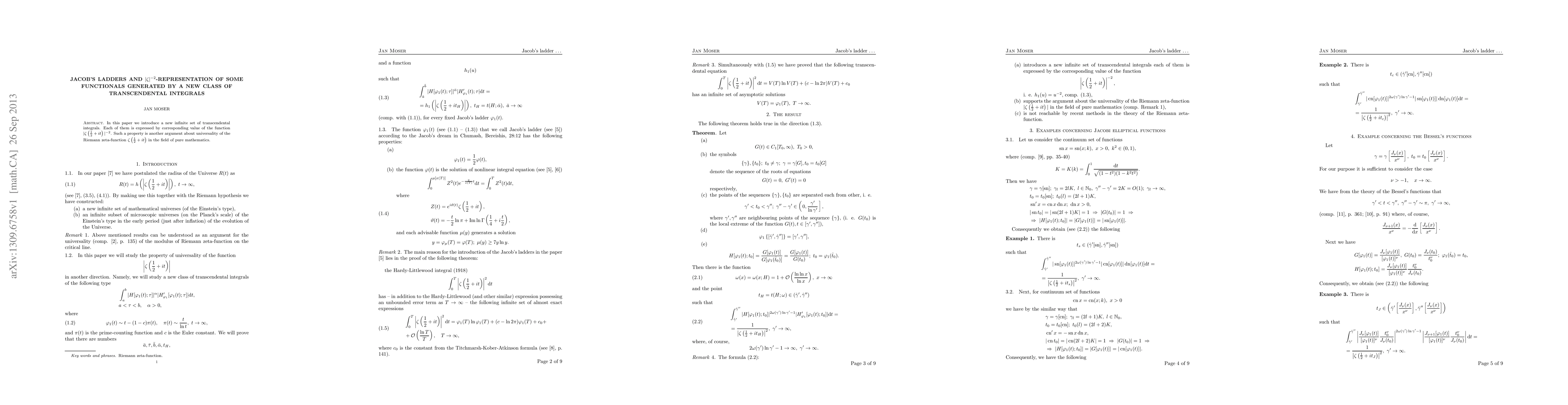 In this paper we introduce a new infinite set of transcendental integrals. Each of them is expressed by corresponding value of the function $|\zf|^{-2}$. Such a property is another argument about universality of the Riemann zeta-function $\zf$ in the field of pure mathematics.