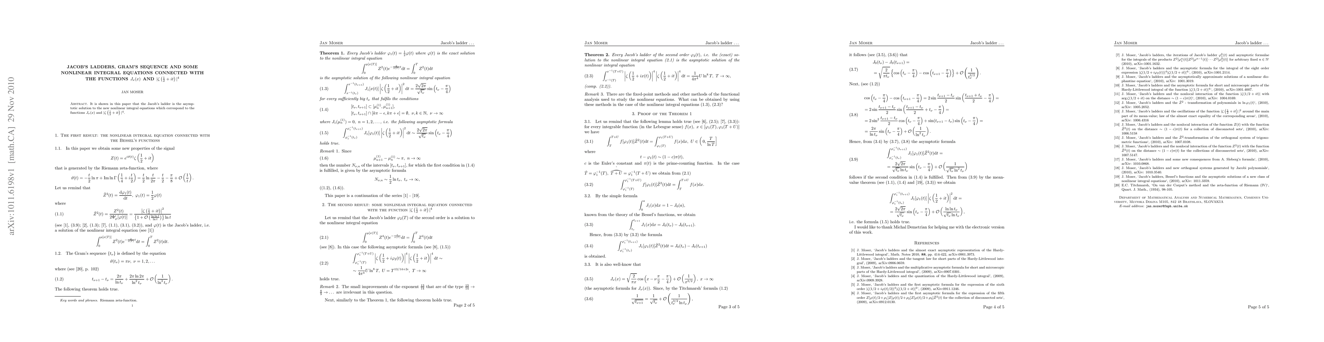 It is shown in this paper that the Jacob's ladder is the asymptotic solution to the new nonlinear integral equations which correspond to the functions $J_\nu(x)$ and $|\zf|^4$.