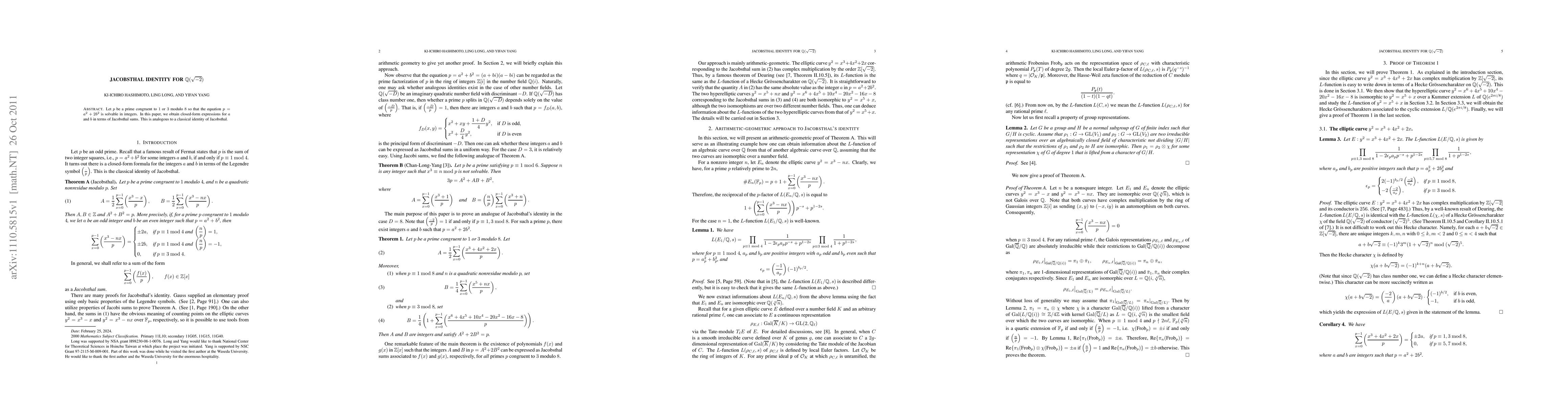 Let $p$ be a prime congruent to 1 or 3 modulo 8 so that the equation $p=a^2+2b^2$ is solvable in integers. In this paper, we obtain closed-form expressions for $a$ and $b$ in terms of Jacobsthal sums. This is analogous to a classical identity of Jacobsthal.