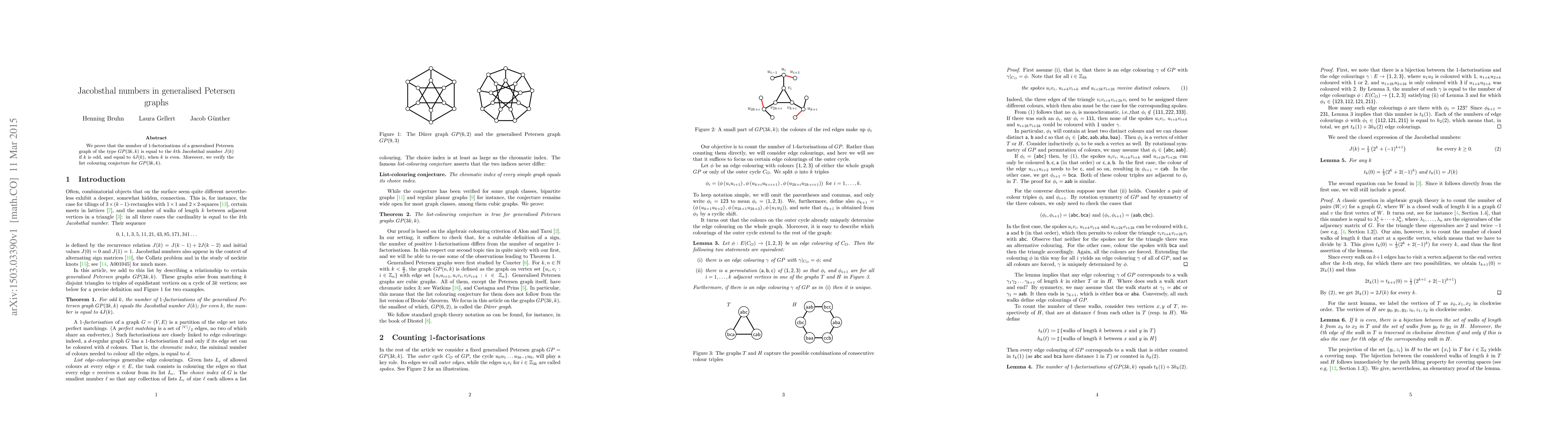 We prove that the number of $1$-factorisations of a generalised Petersen graph of the type $GP(3k,k)$ is equal to the $k$th Jacobsthal number $J(k)$ if $k$ is odd, and equal to $4J(k)$, when $k$ is even. Moreover, we verify the list colouring conjecture for $GP(3k,k)$.
