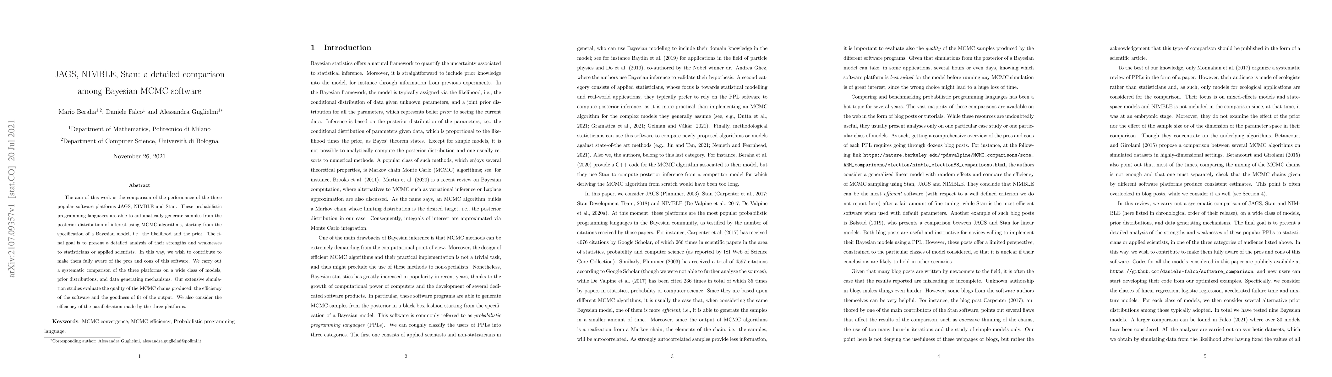 This paper conducts a thorough comparison of the Bayesian MCMC software JAGS, NIMBLE, and Stan, evaluating their performance across various models, priors, and data mechanisms. The study aims to highlight the strengths and weaknesses of each platform to inform statisticians and applied scientists, assessing MCMC chain quality, software efficiency, and parallelization capabilities.