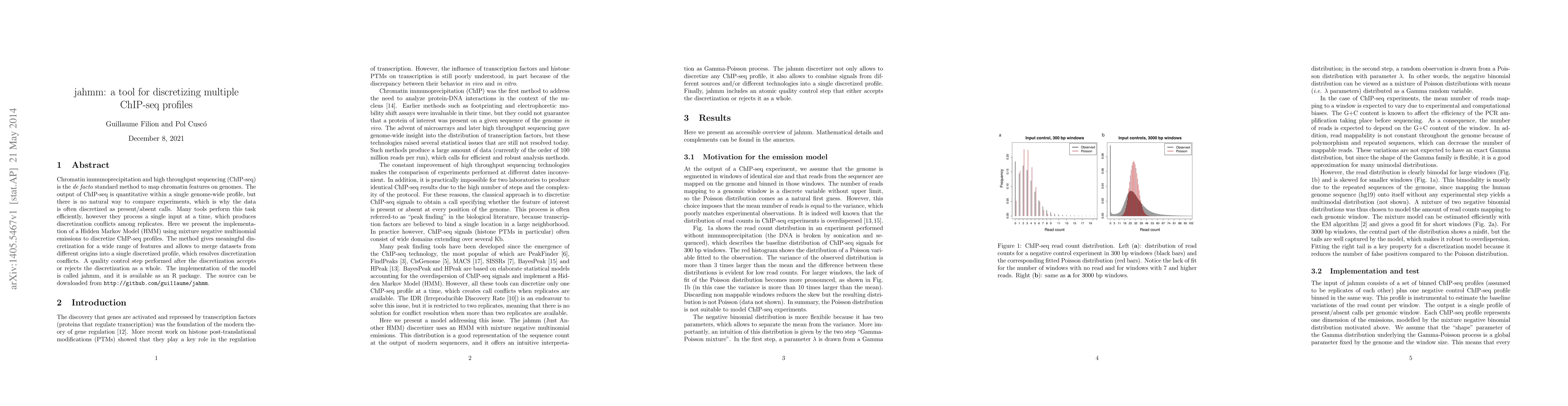 The paper introduces jahmm, an R package that uses a Hidden Markov Model to discretize multiple ChIP-seq profiles into present/absent calls, resolving conflicts among replicates and merging datasets from different origins. The method includes a quality control step to validate the discretization.