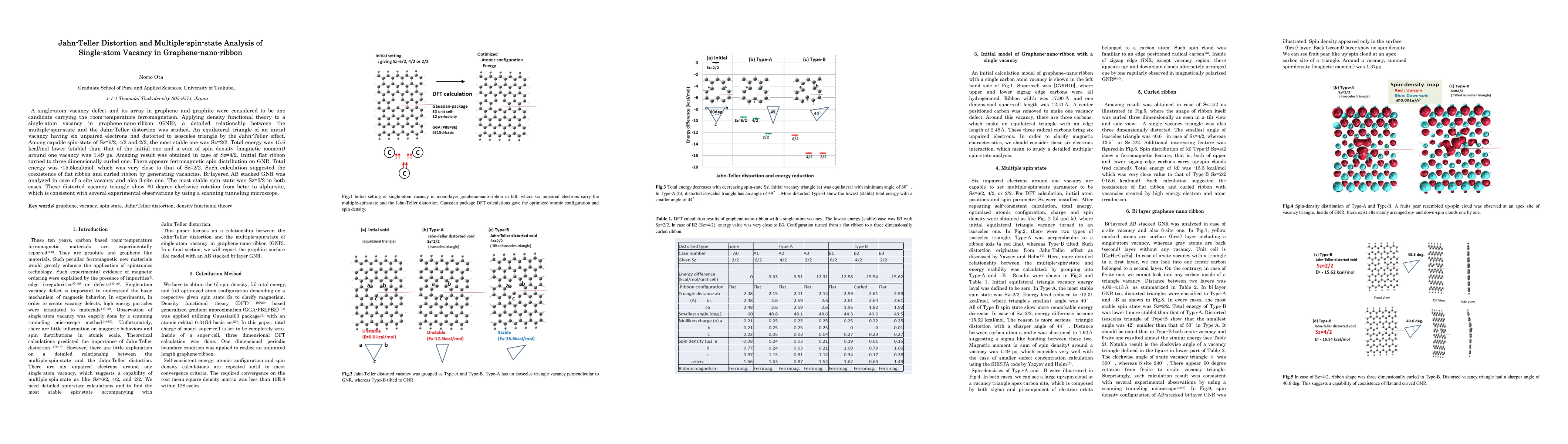 The paper presents a detailed DFT analysis of the relationship between multiple-spin-states and Jahn-Teller distortion in single-atom vacancies of graphene-nano-ribbons.