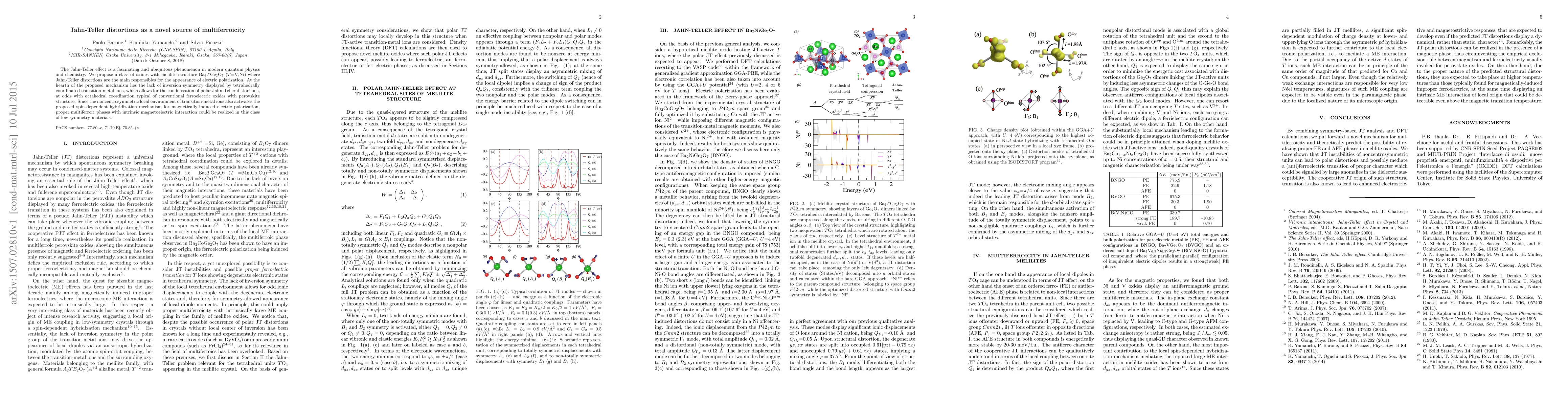 The Jahn-Teller effect is a fascinating and ubiquitous phenomenon in modern quantum physics and chemistry. We propose a class of oxides with melilite structure Ba$_2$TGe$_2$O$_7$ (T=V,Ni) where Jahn-Teller distortions are the main responsibles for the appearance of electric polarization. At the hearth of the proposed mechanism lies the lack of inversion symmetry displayed by tetrahedrally coordinated transition-metal ions, which allows for the condensation of polar Jahn-Teller distortions, at odds with octahedral coordination typical of conventional ferroelectric oxides with perovskite structure. Since the noncentrosymmetric local environment of transition-metal ions also activates the proposed spin-dependent hybridization mechanism for magnetically-induced electric polarization, proper multiferroic phases with intrinsic magnetoelectric interaction could be realized in this class of low-symmetry materials.