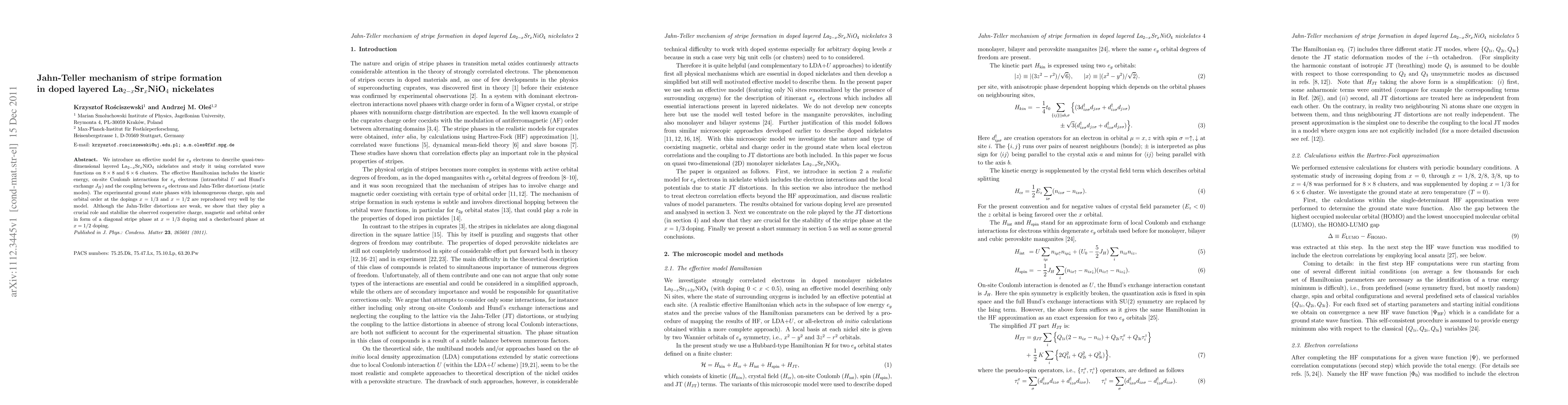 We introduce an effective model for $e_g$ electrons to describe quasi-two-dimensional layered La$_{2-x}$Sr$_{x}$NiO$_4$ nickelates and study it using correlated wave functions on $8 \times 8 $ and $6 \times 6 $ clusters. The effective Hamiltonian includes the kinetic energy, on-site Coulomb interactions for $e_g$ electrons (intraorbital $U$ and Hund's exchange $J_H$) and the coupling between $e_g$ electrons and Jahn-Teller distortions (static modes). The experimental ground state phases with inhomogeneous charge, spin and orbital order at the dopings $x=1/3$ and $x=1/2$ are reproduced very well by the model. Although the Jahn-Teller distortions are weak, we show that they play a crucial role and stabilize the observed cooperative charge, magnetic and orbital order in form of a diagonal stripe phase at $x=1/3$ doping and a checkerboard phase at $x=1/2$ doping.