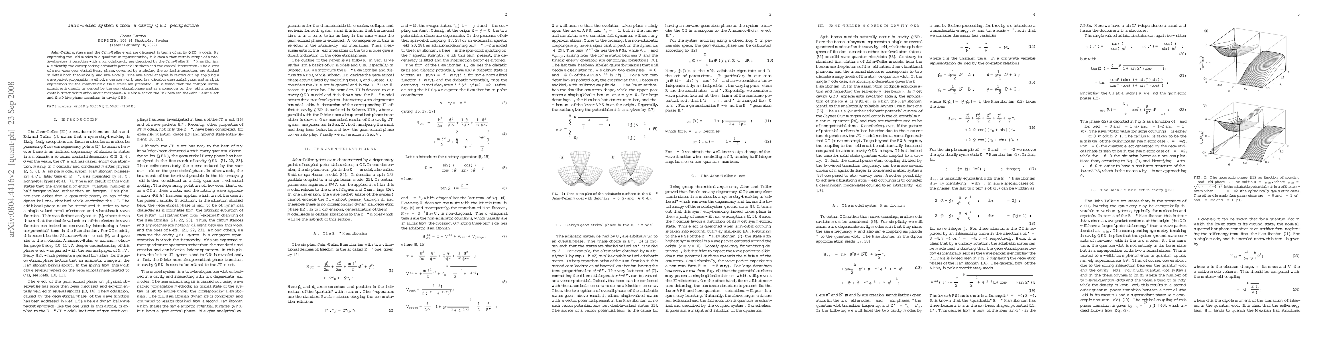 This paper explores Jahn-Teller systems using cavity quantum electrodynamics (QED) models, demonstrating that a two-level system in a bimodal cavity can be described by the Jahn-Teller Hamiltonian. It investigates the effects of a geometrical Berry phase on the collapse-revival structure, revealing that field intensities encode information about this phase.