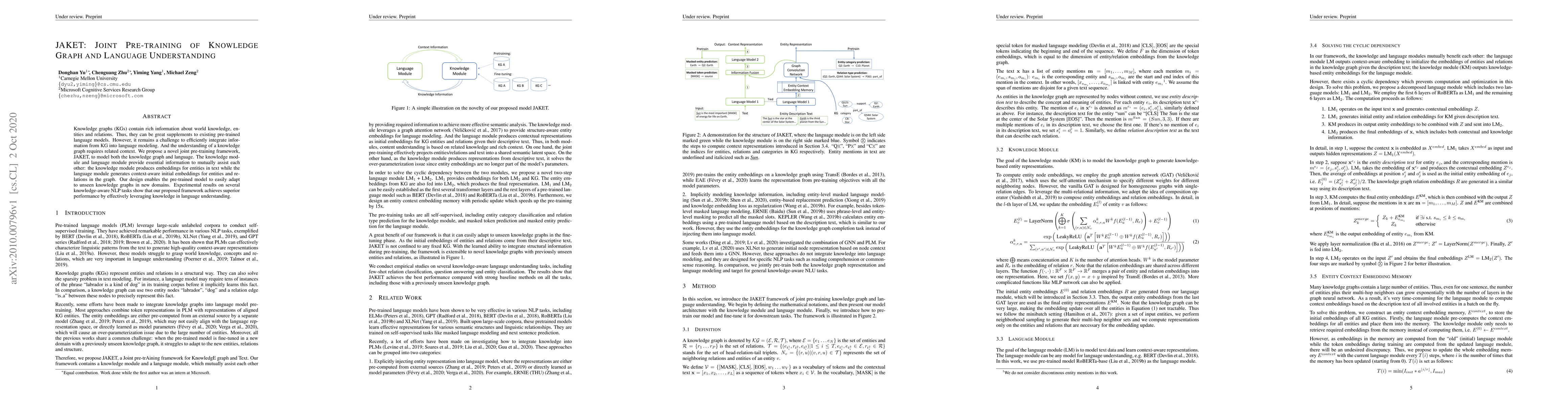 JAKET is a joint pre-training framework that integrates knowledge graphs and language understanding to enhance pre-trained language models. It achieves superior performance on knowledge-aware NLP tasks by mutually enhancing the knowledge module and language module through their shared embeddings.