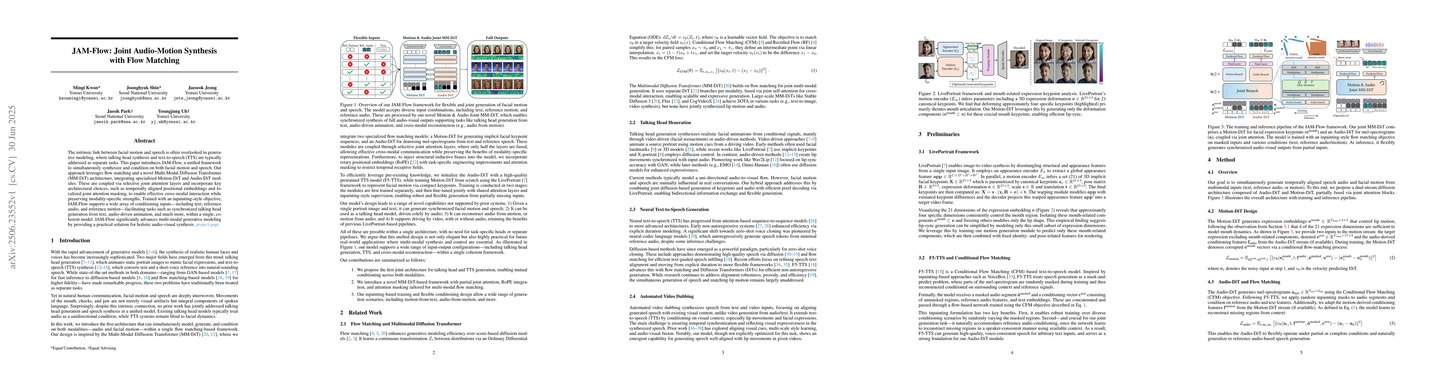 The intrinsic link between facial motion and speech is often overlooked in generative modeling, where talking head synthesis and text-to-speech (TTS) are typically addressed as separate tasks. This paper introduces JAM-Flow, a unified framework to simultaneously synthesize and condition on both facial motion and speech. Our approach leverages flow matching and a novel Multi-Modal Diffusion Transformer (MM-DiT) architecture, integrating specialized Motion-DiT and Audio-DiT modules. These are coupled via selective joint attention layers and incorporate key architectural choices, such as temporally aligned positional embeddings and localized joint attention masking, to enable effective cross-modal interaction while preserving modality-specific strengths. Trained with an inpainting-style objective, JAM-Flow supports a wide array of conditioning inputs-including text, reference audio, and reference motion-facilitating tasks such as synchronized talking head generation from text, audio-driven animation, and much more, within a single, coherent model. JAM-Flow significantly advances multi-modal generative modeling by providing a practical solution for holistic audio-visual synthesis. project page: https://joonghyuk.com/jamflow-web
