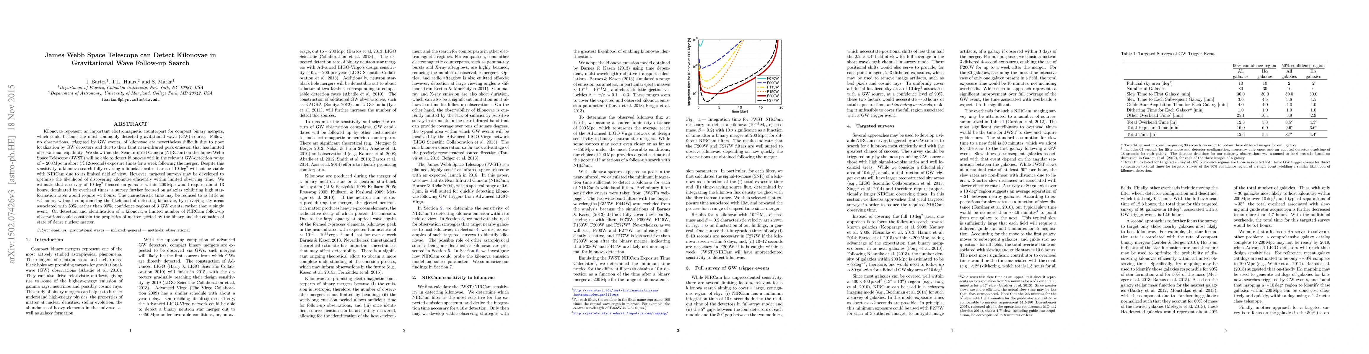 Kilonovae represent an important electromagnetic counterpart for compact binary mergers, which could become the most commonly detected gravitational wave (GW) source. Follow-up observations, triggered by GW events, of kilonovae are nevertheless difficult due to poor localization by GW detectors and due to their faint near-infrared peak emission that has limited observational capability. We show that the Near-Infrared Camera (NIRCam) on the James Webb Space Telescope (JWST) will be able to detect kilonovae within the relevant GW-detection range of $\sim$ 200 Mpc in short ($\lesssim$ 12-second) exposure times for a week following the merger. Despite this sensitivity, a kilonova search fully covering a fiducial localized area of $10$ $\mbox{deg}^2$ will not be viable with NIRCam due to its limited field of view. However, targeted surveys may be developed to optimize the likelihood of discovering kilonovae efficiently within limited observing time. We estimate that a survey of $10$ $\mbox{deg}^2$ focused on galaxies within 200 Mpc would require about 13 hours, dominated by overhead times; a survey further focused on galaxies exhibiting high star-formation rates would require $\sim$ 5 hours. The characteristic time may be reduced to as little as $\sim$4 hours, without compromising the likelihood of detecting kilonovae, by surveying sky areas associated with 50%, rather than 90%, confidence regions of 3 GW events, rather than a single event. On detection and identification of a kilonova, a limited number of NIRCam follow-up observations could constrain the properties of matter ejected by the binary and the equation of state of dense nuclear matter.