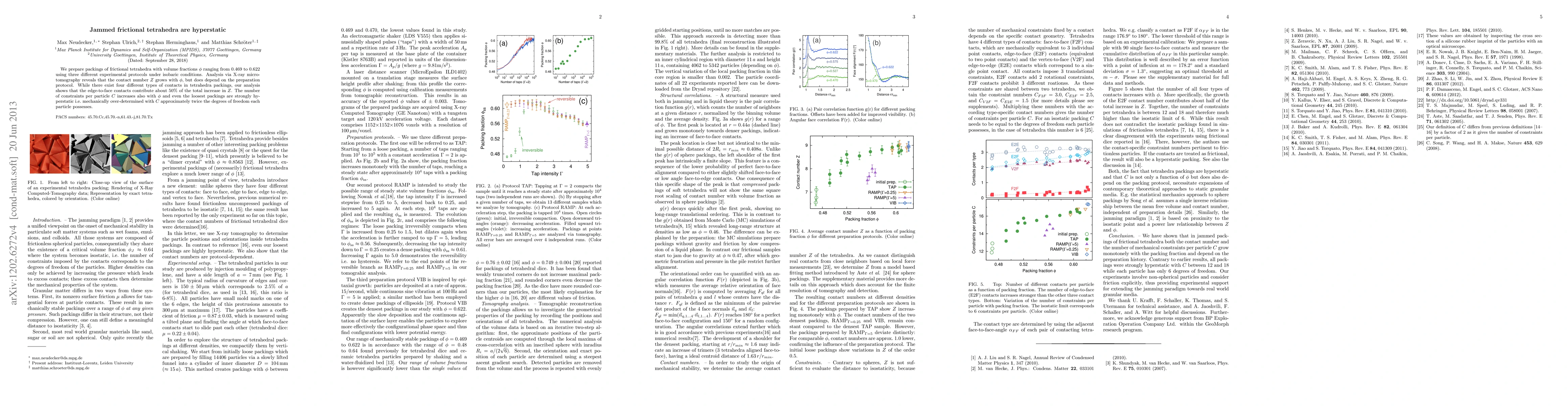 This study investigates jammed packings of frictional tetrahedra, revealing that the contact number increases with volume fraction and is influenced by preparation protocols. Despite four types of contacts, edge-to-face contacts account for half the increase in contact number, and all packings remain hyperstatic, with constraints nearly doubling the degrees of freedom per particle.