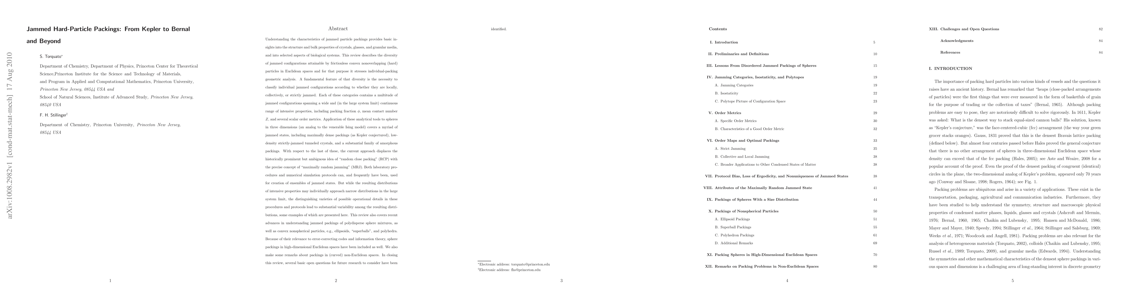 This review explores diverse jammed configurations of frictionless hard particles, classifying them into locally, collectively, or strictly jammed states, and introduces the concept of "maximally random jamming" (MRJ) to replace "random close packing." It also covers recent advances in polydisperse mixtures and non-spherical particles, and touches on high-dimensional sphere packings relevant to information theory.