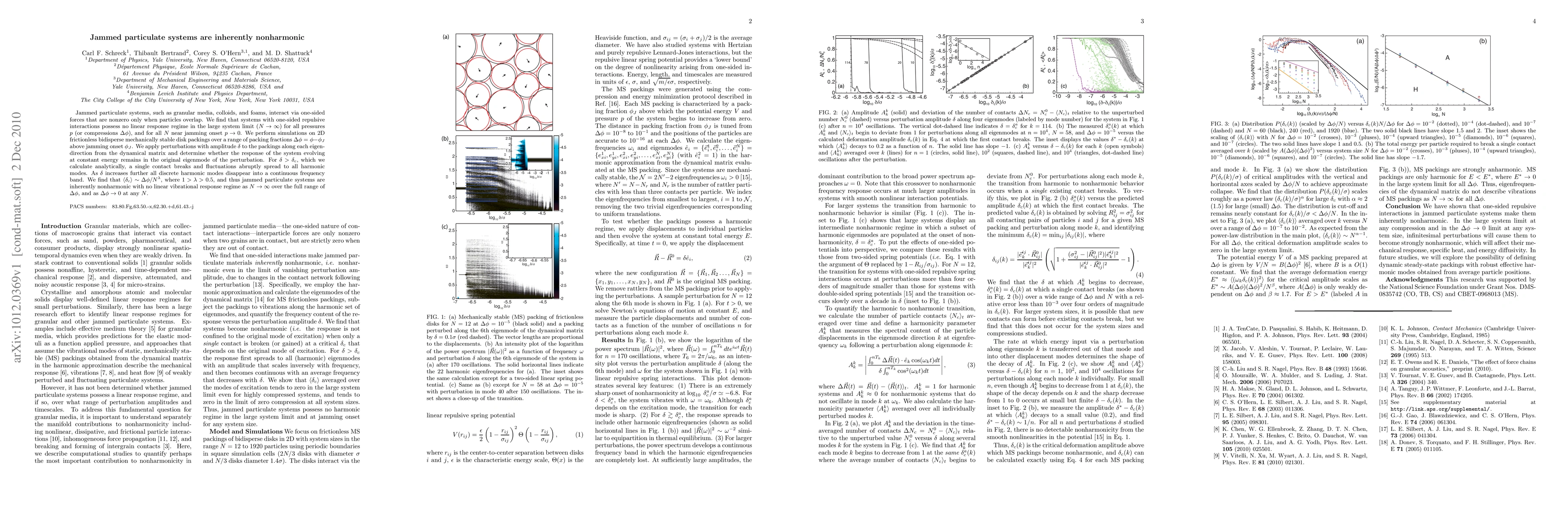 Jammed particulate systems, such as granular media, colloids, and foams, interact via one-sided forces that are nonzero only when particles overlap. We find that systems with one-sided repulsive interactions possess no linear response regime in the large system limit ($N\rightarrow \infty$) for all pressures $p$ (or compressions $\Delta \phi$), and for all $N$ near jamming onset $p\rightarrow 0$. We perform simulations on 2D frictionless bidisperse mechanically stable disk packings over a range of packing fractions $\Delta \phi = \phi-\phi_J$ above jamming onset $\phi_J$. We apply perturbations with amplitude $\delta$ to the packings along each eigen-direction from the dynamical matrix and determine whether the response of the system evolving at constant energy remains in the original eigenmode of the perturbation. For $\delta > \delta_c$, which we calculate analytically, a single contact breaks and fluctuations abruptly spread to all harmonic modes. As $\delta$ increases further all discrete harmonic modes disappear into a continuous frequency band. We find that $<\delta_c >\sim \Delta \phi/N^{\lambda}$, where $1 > \lambda > 0.5$, and thus jammed particulate systems are inherently nonharmonic with no linear vibrational response regime as $N\rightarrow \infty$ over the full range of $\Delta \phi$, and as $\Delta \phi \rightarrow 0$ at any $N$.