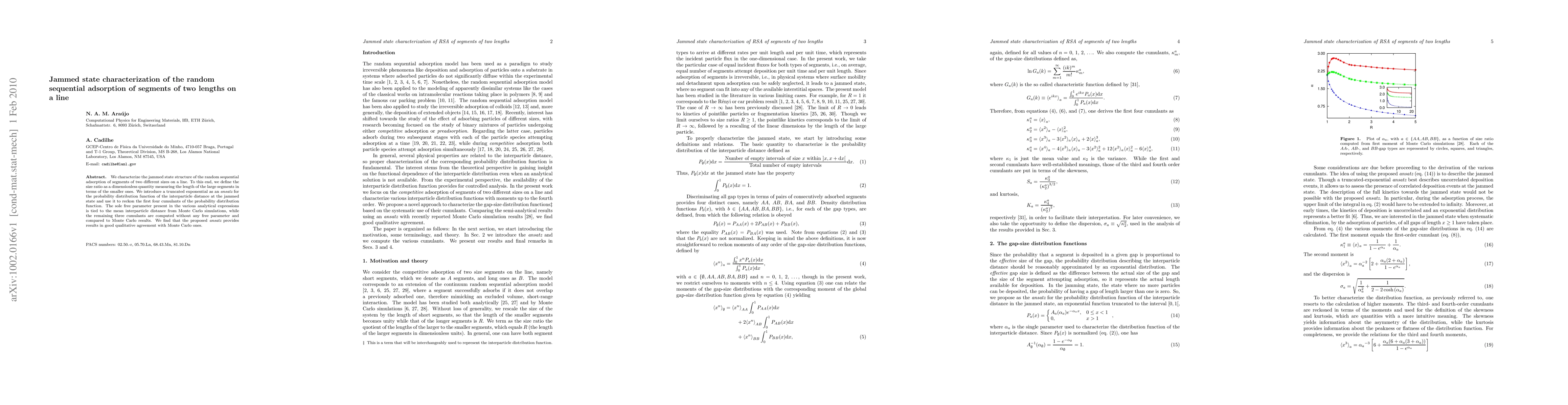 We characterize the jammed state structure of the random sequential adsorption of segments of two different sizes on a line. To this end, we define the size ratio as a dimensionless quantity measuring the length of the large segments in terms of the smaller ones. We introduce a truncated exponential as an {\it ansatz} for the probability distribution function of the interparticle distance at the jammed state and use it to reckon the first four cumulants of the probability distribution function. The sole free parameter present in the various analytical expressions is tied to the mean interparticle distance from Monte Carlo simulations, while the remaining three cumulants are computed without any free parameter and compared to Monte Carlo results. We find that the proposed {\it ansatz} provides results in good qualitative agreement with Monte Carlo ones.