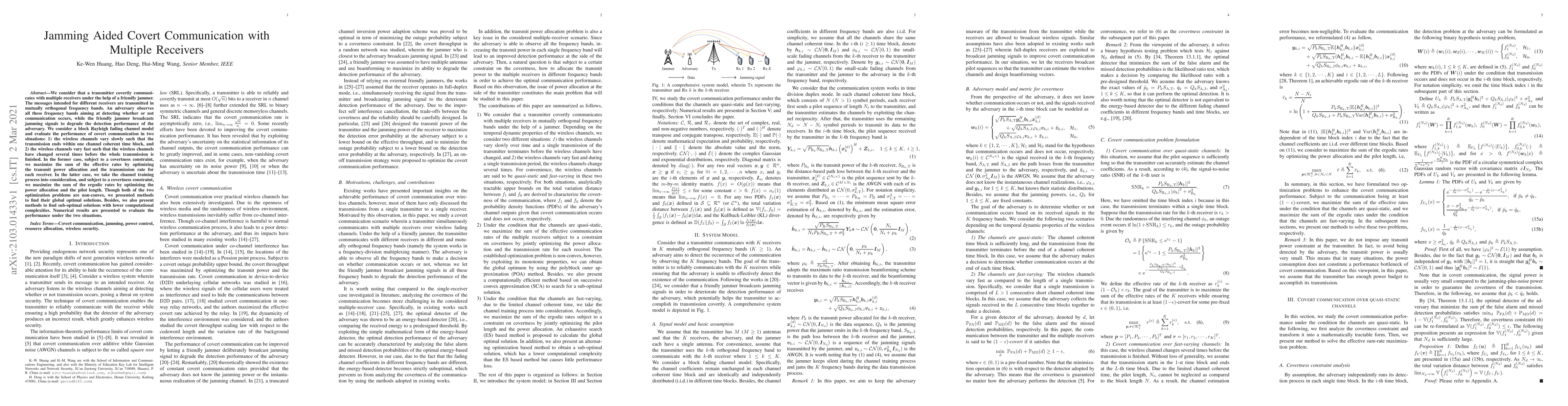 We consider that a transmitter covertly communicates with multiple receivers under the help of a friendly jammer. The messages intended for different receivers are transmitted in mutually orthogonal frequency bands. An adversary observes all these frequency bands aiming at detecting whether or not communication occurs, while the friendly jammer broadcasts jamming signals to degrade the detection performance of the adversary. We consider a block Rayleigh fading channel model and evaluate the performance of covert communication in two situations: 1) the wireless channels vary slowly such that the transmission ends within one channel coherent time block, and 2) the wireless channels vary fast such that the wireless channels have changed several times before the whole transmission is finished. In the former case, subject to a covertness constraint, we maximize the sum of the effective rates by optimizing the transmit power allocation and the transmission rate for each receiver. In the latter case, we take the channel training process into consideration, and subject to a covertness constraint, we maximize the sum of the ergodic rates by optimizing the power allocation and the pilot length. Though both of the two optimization problems are non-convex, we presented methods to find their global optimal solutions. Besides, we also present methods to find sub-optimal solutions with lower computational complexities. Numerical results are presented to evaluate the performance under the two situations.