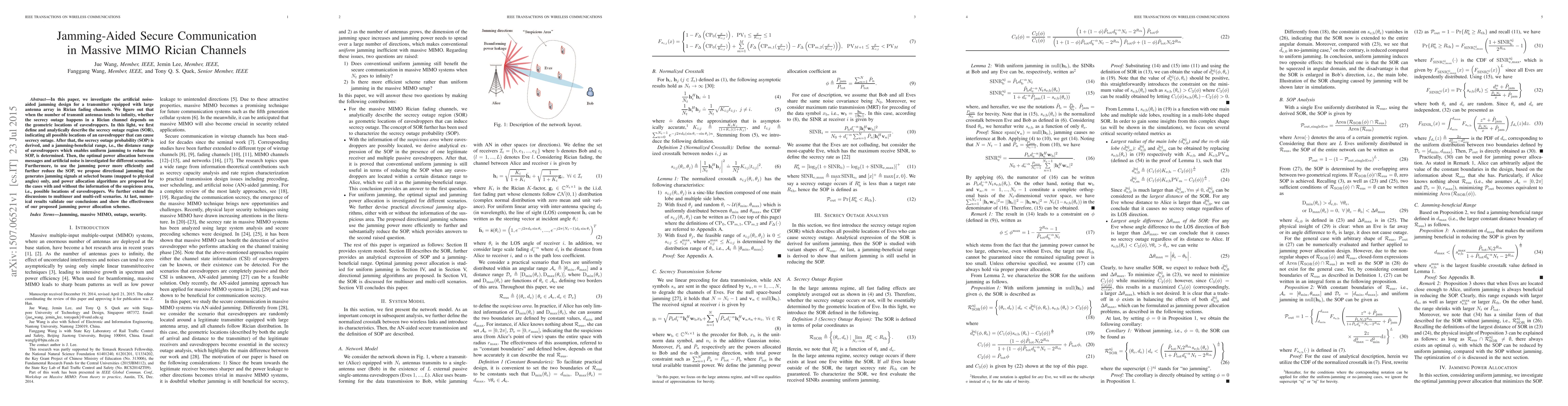 In this paper, we investigate the artificial noise-aided jamming design for a transmitter equipped with large antenna array in Rician fading channels. We figure out that when the number of transmit antennas tends to infinity, whether the secrecy outage happens in a Rician channel depends on the geometric locations of eavesdroppers. In this light, we first define and analytically describe the secrecy outage region (SOR), indicating all possible locations of an eavesdropper that can cause secrecy outage. After that, the secrecy outage probability (SOP) is derived, and a jamming-beneficial range, i.e., the distance range of eavesdroppers which enables uniform jamming to reduce the SOP, is determined. Then, the optimal power allocation between messages and artificial noise is investigated for different scenarios. Furthermore, to use the jamming power more efficiently and further reduce the SOP, we propose directional jamming that generates jamming signals at selected beams (mapped to physical angles) only, and power allocation algorithms are proposed for the cases with and without the information of the suspicious area, i.e., possible locations of eavesdroppers. We further extend the discussions to multiuser and multi-cell scenarios. At last, numerical results validate our conclusions and show the effectiveness of our proposed jamming power allocation schemes.