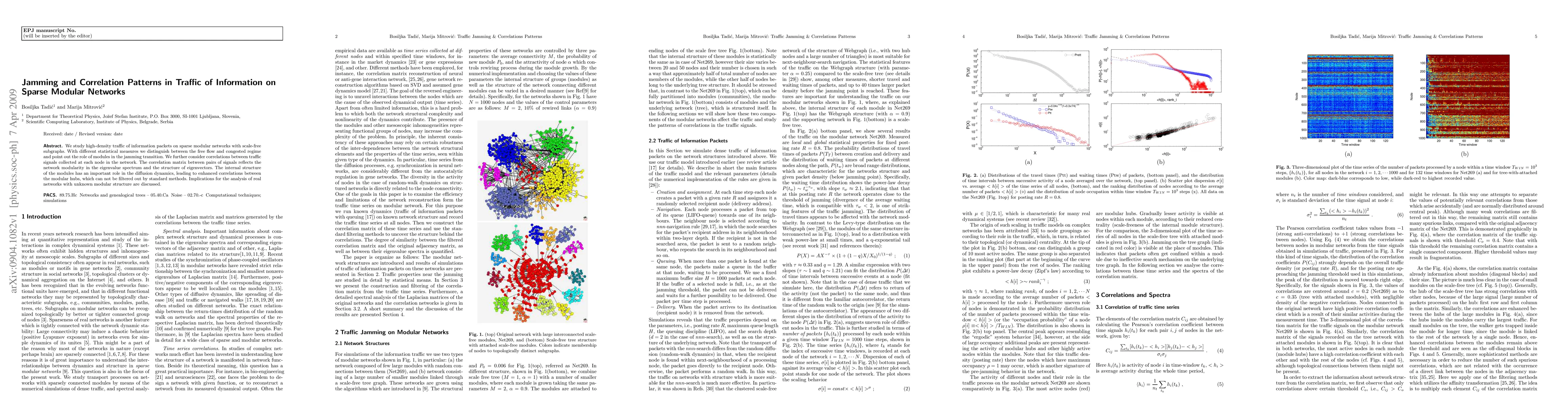 This paper investigates the traffic dynamics of information packets on sparse modular networks, identifying regimes of free flow and congestion, and the role of modules in the jamming transition. It also examines correlations between traffic signals, revealing that the internal structure of modules significantly influences diffusion dynamics and enhances correlations among modular hubs.