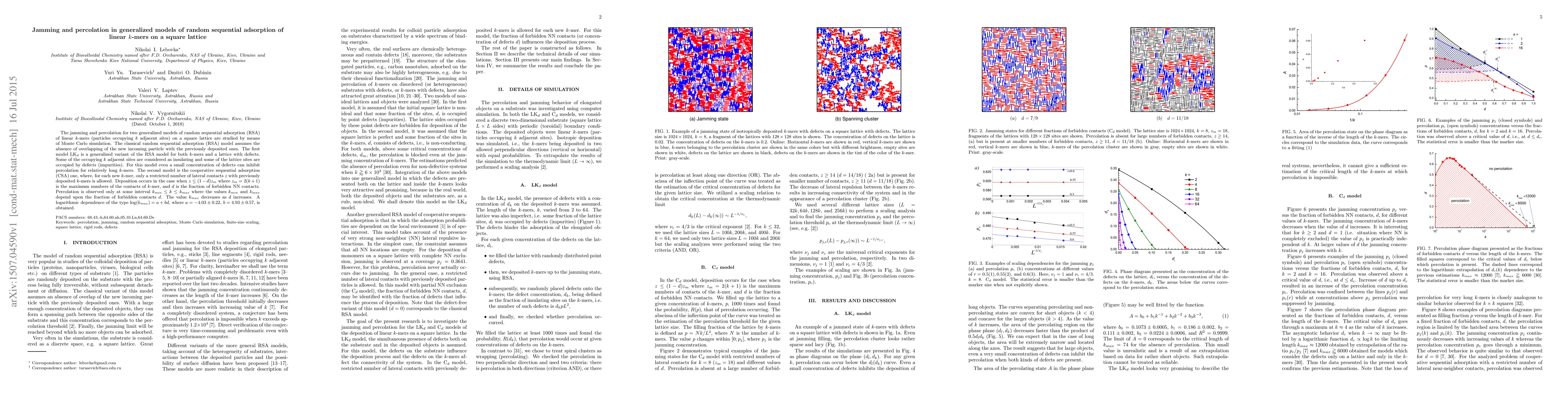 This research explores jamming and percolation in two generalized models of random sequential adsorption of linear $k$-mers on a square lattice via Monte Carlo simulations. The first model, LK$_d$, introduces defects that inhibit percolation even at low defect concentrations. The second model, CSA, allows only a limited number of lateral contacts, leading to percolation within a specific range of $k$-mer lengths dependent on the fraction of forbidden contacts, with $k_{max}$ decreasing logarithmically as forbidden contacts increase.