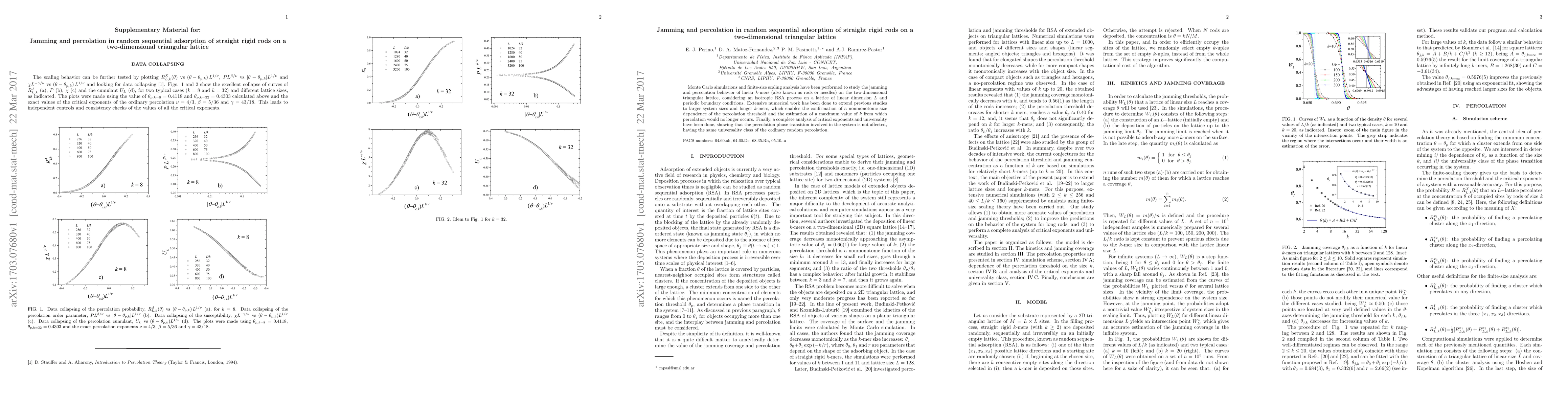 This paper investigates jamming and percolation in random sequential adsorption of rigid rods on a two-dimensional triangular lattice using Monte Carlo simulations. It confirms a nonmonotonic size dependence of the percolation threshold and identifies a maximum rod length beyond which percolation ceases, with critical exponents indicating the same universality class as ordinary random percolation.