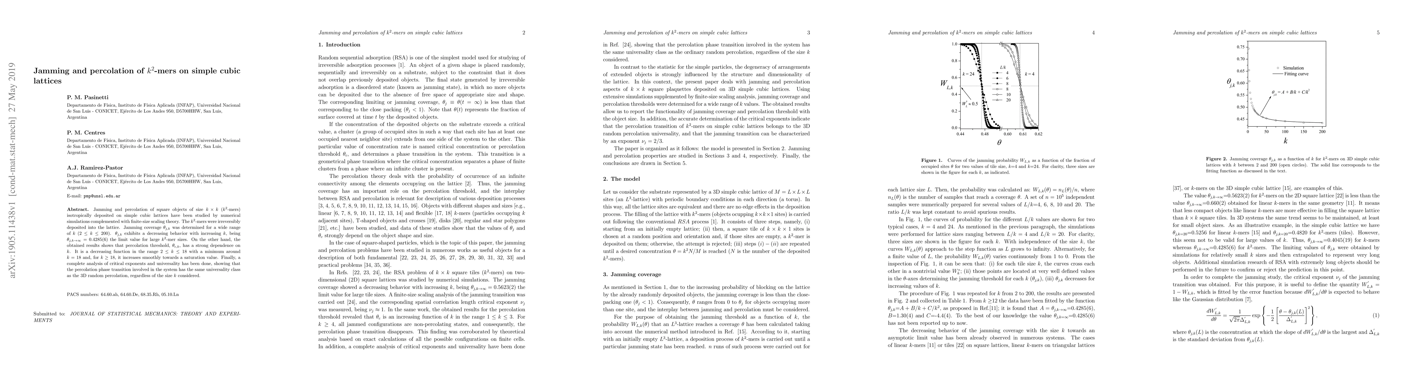 Jamming and percolation of square objects of size $k \times k$ ($k^2$-mers) isotropically deposited on simple cubic lattices have been studied by numerical simulations complemented with finite-size scaling theory. The $k^2$-mers were irreversibly deposited into the lattice. Jamming coverage $\theta_{j,k}$ was determined for a wide range of $k$ ($2 \leq k \leq 200$). $\theta_{j,k}$ exhibits a decreasing behavior with increasing $k$, being $\theta_{j,k\rightarrow\infty}=0.4285(6)$ the limit value for large $k^2$-mer sizes. On the other hand, the obtained results shows that percolation threshold, $\theta_{c,k}$, has a strong dependence on $k$. It is a decreasing function in the range $2 \leq k \leq 18$ with a minimum around $k=18$ and, for $k \geq 18$, it increases smoothly towards a saturation value. Finally, a complete analysis of critical exponents and universality has been done, showing that the percolation phase transition involved in the system has the same universality class as the 3D random percolation, regardless of the size $k$ considered.