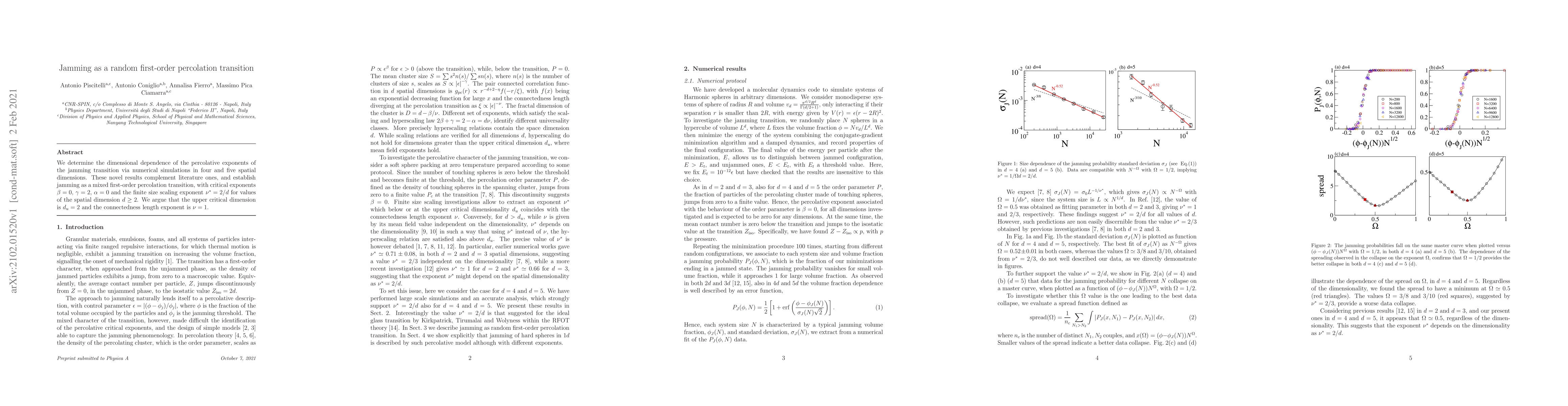 We determine the dimensional dependence of the percolative exponents of the jamming transition via numerical simulations in four and five spatial dimensions. These novel results complement literature ones, and establish jamming as a mixed first-order percolation transition, with critical exponents $\beta =0$, $\gamma = 2$, $\alpha = 0$ and the finite size scaling exponent $\nu^* = 2/d$ for values of the spatial dimension $d \geq 2$. We argue that the upper critical dimension is $d_u=2$ and the connectedness length exponent is $\nu =1$.