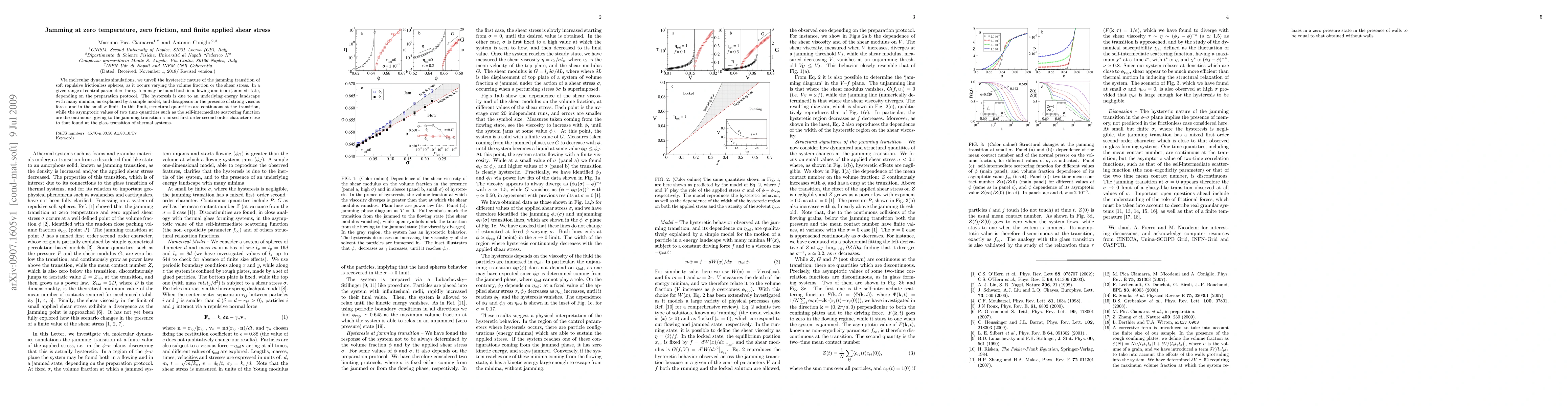 This paper uses molecular dynamics simulations to explore the hysteretic jamming transition in frictionless spheres under varying volume fractions and shear stress, revealing a complex energy landscape. The transition exhibits mixed first-order and second-order characteristics, depending on the preparation protocol and the presence of viscous forces.