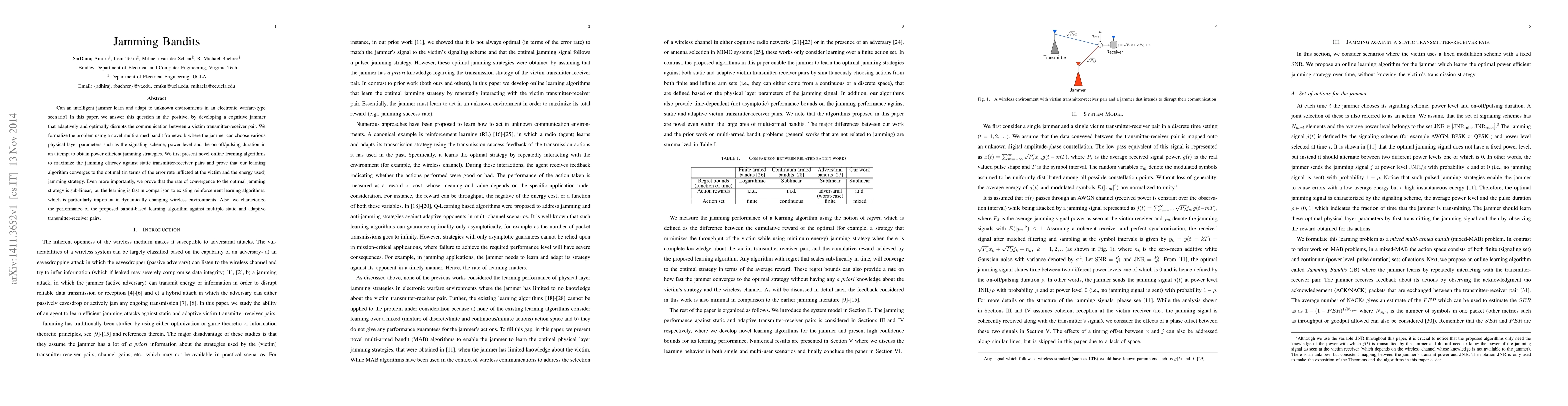 Can an intelligent jammer learn and adapt to unknown environments in an electronic warfare-type scenario? In this paper, we answer this question in the positive, by developing a cognitive jammer that adaptively and optimally disrupts the communication between a victim transmitter-receiver pair. We formalize the problem using a novel multi-armed bandit framework where the jammer can choose various physical layer parameters such as the signaling scheme, power level and the on-off/pulsing duration in an attempt to obtain power efficient jamming strategies. We first present novel online learning algorithms to maximize the jamming efficacy against static transmitter-receiver pairs and prove that our learning algorithm converges to the optimal (in terms of the error rate inflicted at the victim and the energy used) jamming strategy. Even more importantly, we prove that the rate of convergence to the optimal jamming strategy is sub-linear, i.e. the learning is fast in comparison to existing reinforcement learning algorithms, which is particularly important in dynamically changing wireless environments. Also, we characterize the performance of the proposed bandit-based learning algorithm against multiple static and adaptive transmitter-receiver pairs.