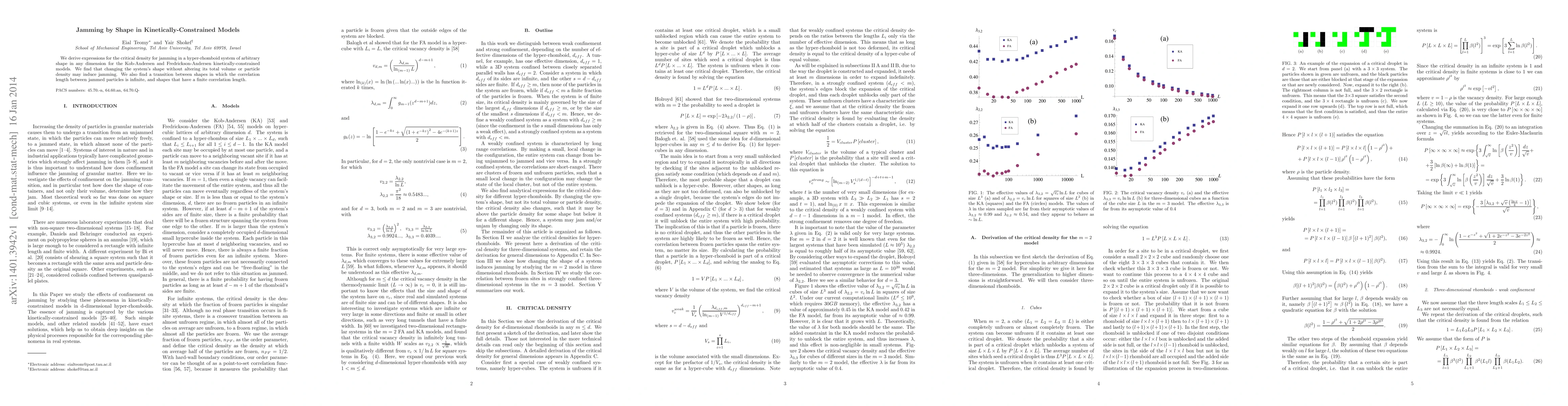 This paper derives critical jamming density expressions for hyper-rhomboid systems in kinetically-constrained models, revealing that shape changes can induce jamming without volume or density alterations, and identifies a transition in jammed particle correlation lengths.