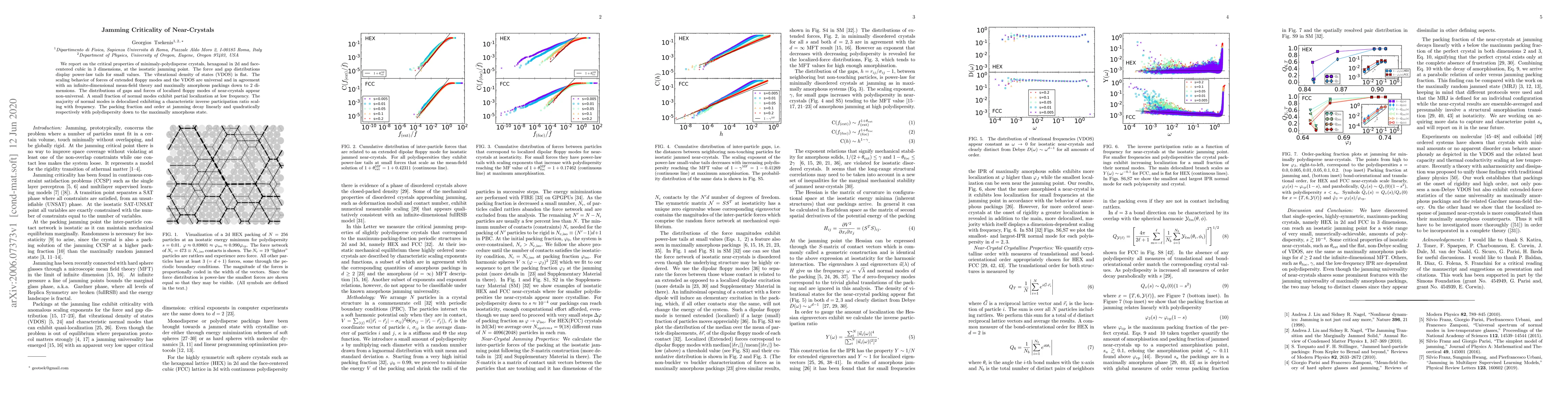 Researchers studied the properties of near-crystals at their jamming point, finding that force and gap distributions follow power-law tails, while vibrational density of states is flat; these findings support infinite-dimensional mean-field theory and amorphous packings.
