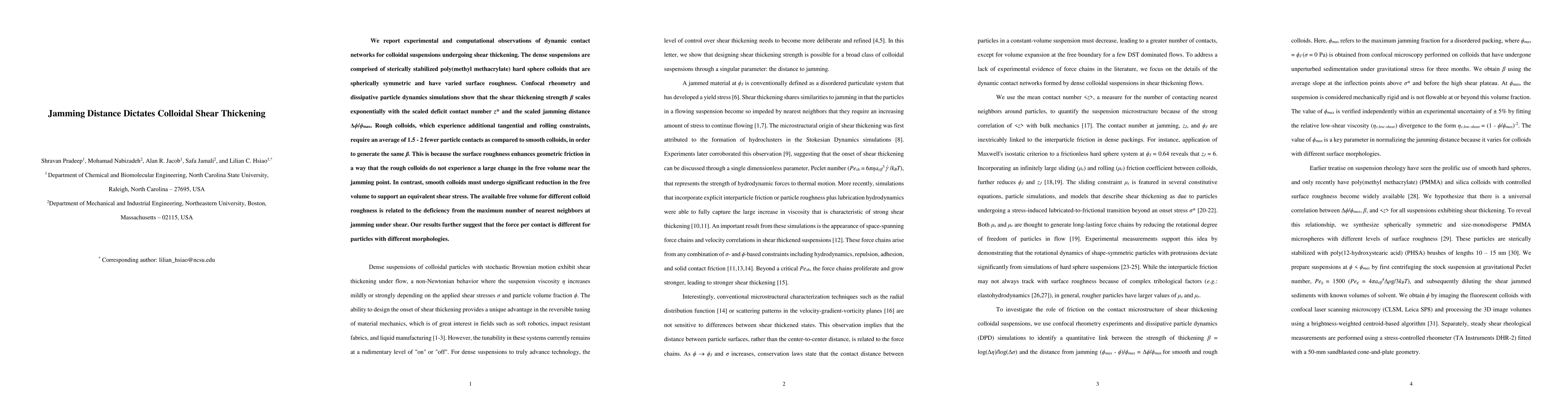 This study reveals that colloidal shear thickening strength is exponentially related to the scaled deficit contact number and jamming distance, with rough colloids requiring fewer contacts due to enhanced geometric friction compared to smooth colloids. The findings suggest different force per contact dynamics for particles with varied morphologies.