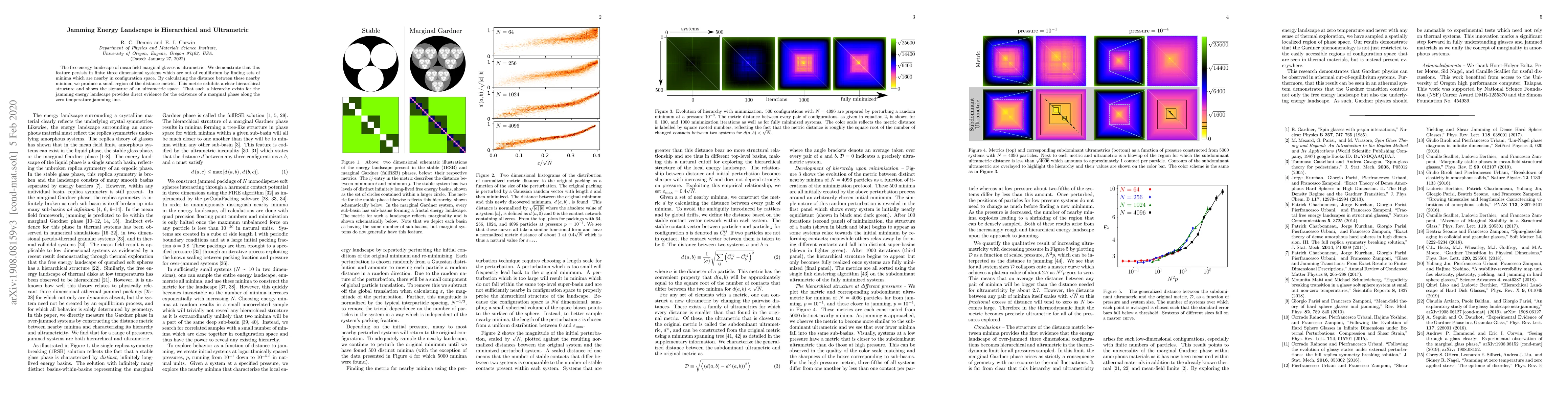 This paper demonstrates that the jamming energy landscape in three-dimensional systems exhibits an ultrametric structure, revealing a hierarchical organization of nearby minima. This finding supports the existence of a marginal phase along the zero-temperature jamming line.