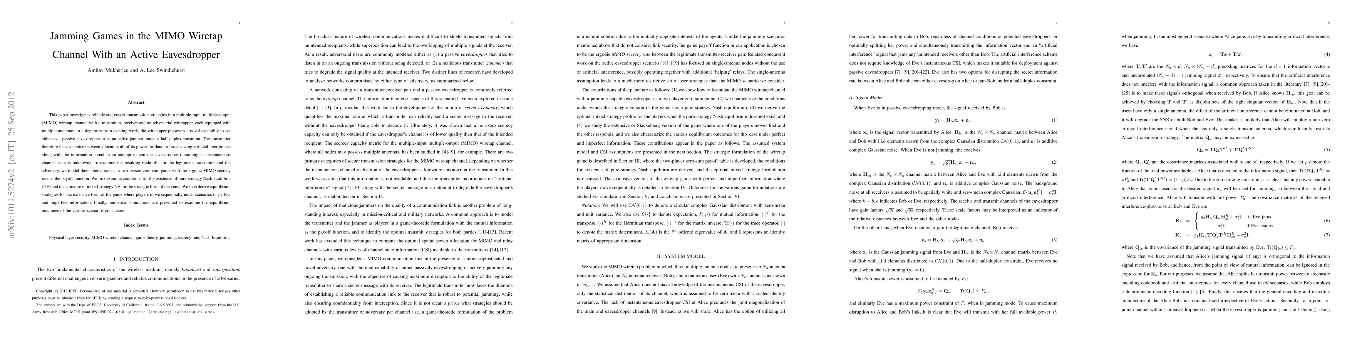 A new study explores secure transmission strategies in a MIMO wiretap channel with an active eavesdropper who can act as either a passive listener or an active jammer. The researchers model the game between the transmitter and adversary using a two-person zero-sum game to examine trade-offs and equilibrium outcomes.