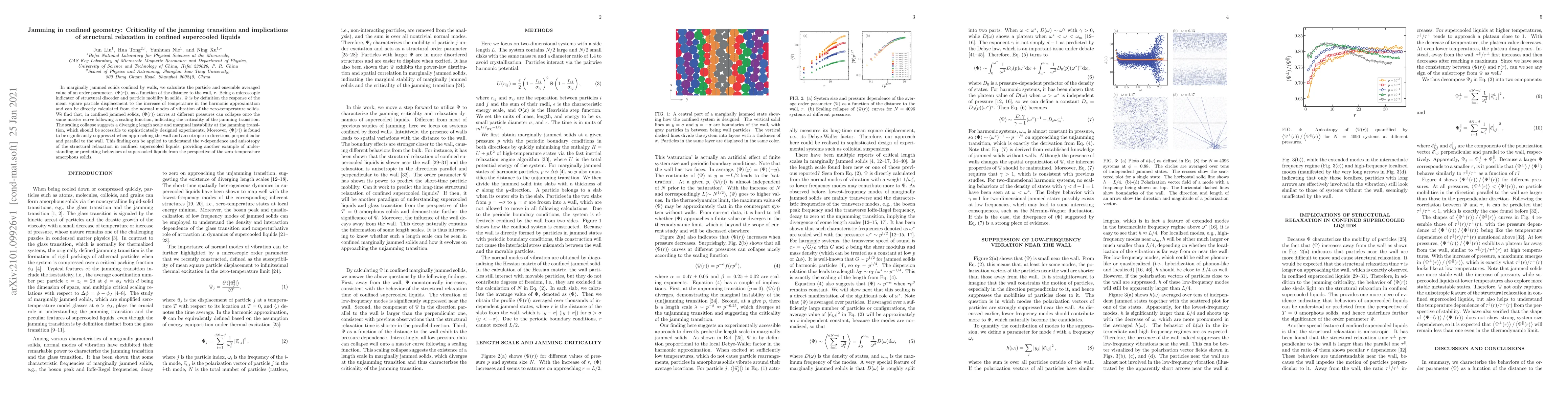 This paper investigates the jamming transition in confined solids, finding that the order parameter $\left<\Psi(r)\right>$ collapses onto a master curve, indicating criticality and marginal instability. The study also reveals anisotropic suppression of $\left<\Psi(r)\right>$ near walls, which aids in understanding structural relaxation in confined supercooled liquids.