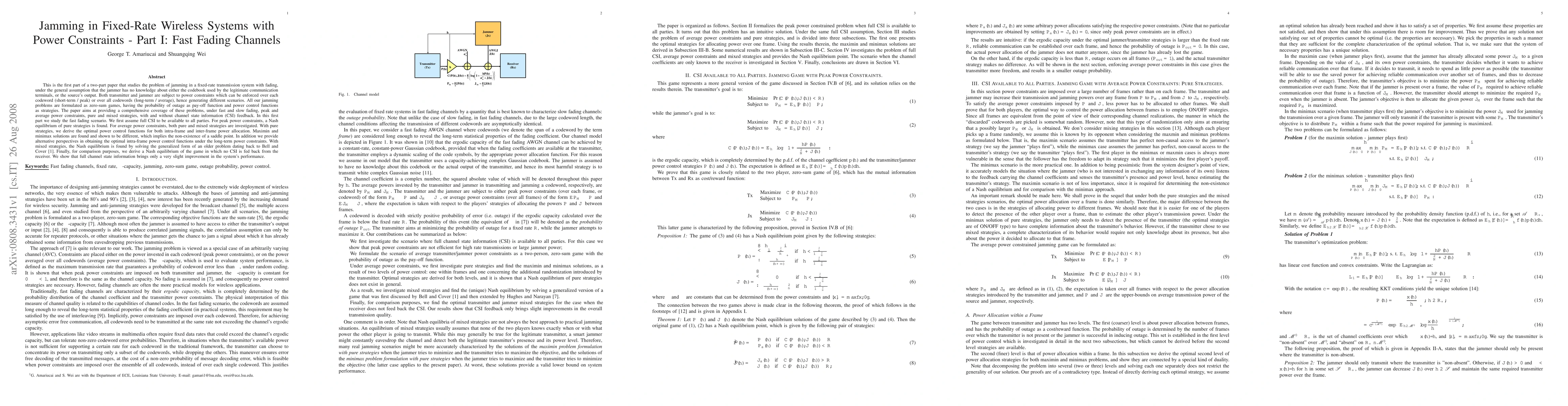 This research paper studies jamming in fixed-rate wireless systems with power constraints, focusing on fast fading channels, and finding Nash equilibria for peak and average power constraints under full and no channel state information feedback.