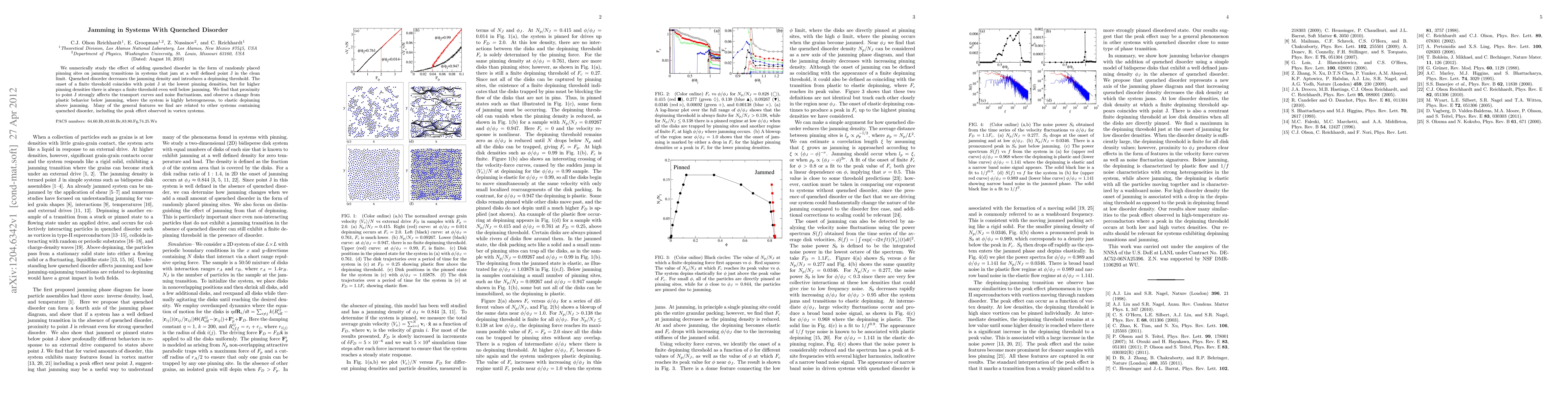 This paper investigates how quenched disorder, introduced via randomly placed pinning sites, influences jamming transitions in disordered systems. It finds that while quenched disorder decreases jamming density and introduces a depinning threshold, the proximity to the jamming point J significantly impacts transport and noise fluctuations, transitioning from plastic to elastic behavior.