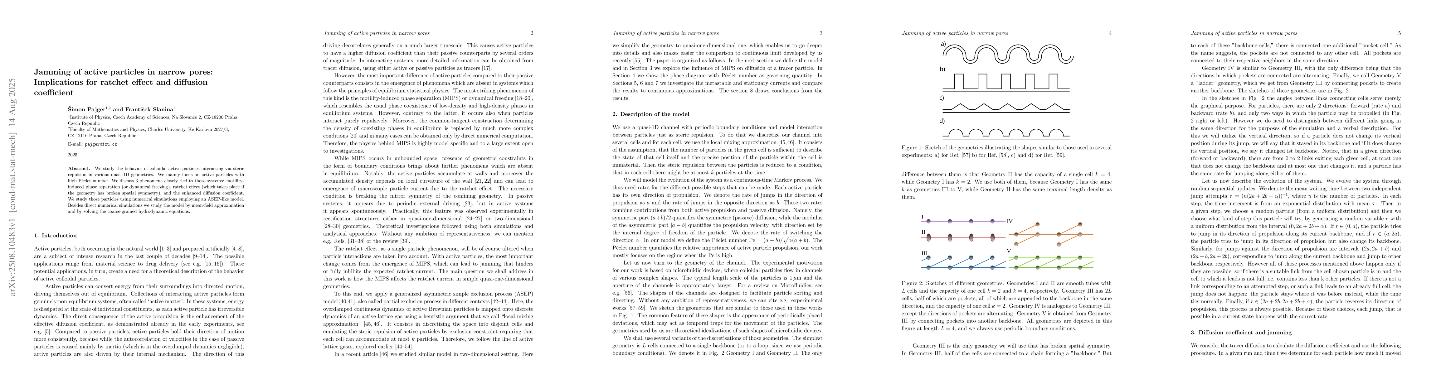 We study the behavior of colloidal active particles interacting via steric repulsion in various quasi-1D geometries. We mainly focus on active particles with high P\'eclet number. We discuss 3 phenomena closely tied to those systems: motility-induced phase separation (or dynamical freezing), ratchet effect (which takes place if the geometry has broken spatial symmetry), and the enhanced diffusion coefficient. We study those particles using numerical simulations employing an ASEP-like model. Besides direct numerical simulations we study the model by mean-field approximation and by solving the coarse-grained hydrodynamic equations.