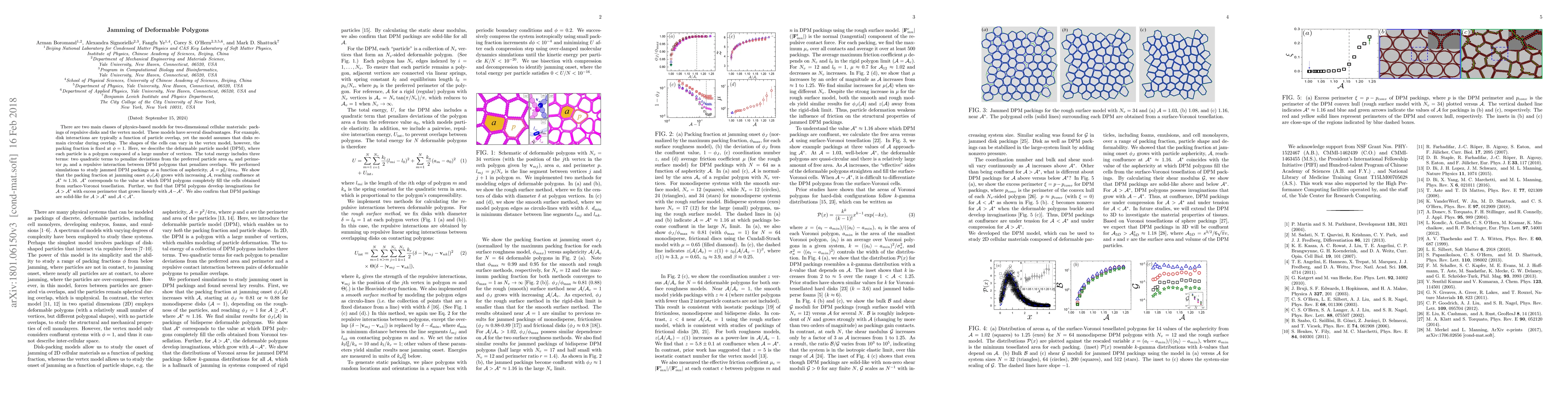 There are two main classes of physics-based models for two-dimensional cellular materials: packings of repulsive disks and the vertex model. These models have several disadvantages. For example, disk interactions are typically a function of particle overlap, yet the model assumes that the disks remain circular during overlap. The shapes of the cells can vary in the vertex model, however, the packing fraction is fixed at $\phi=1$. Here, we describe the deformable particle model (DPM), where each particle is a polygon composed of a large number of vertices. The total energy includes three terms: two quadratic terms to penalize deviations from the preferred particle area $a_0$ and perimeter $p_0$ and a repulsive interaction between DPM polygons that penalizes overlaps. We performed simulations to study the onset of jamming in packings of DPM polygons as a function of asphericity, ${\cal A} = p_0^2/4\pi a_0$. We show that the packing fraction at jamming onset $\phi_J({\cal A})$ grows with increasing ${\cal A}$, reaching confluence at ${\cal A} \approx 1.16$. ${\cal A}^*$ corresponds to the value at which DPM polygons completely fill the cells obtained from a surface-Voronoi tessellation. Further, we show that DPM polygons develop invaginations for ${\cal A} > {\cal A}^*$ with excess perimeter that grows linearly with ${\cal A}-{\cal A}^*$. We confirm that packings of DPM polygons are solid-like over the full range of ${\cal A}$ by showing that the shear modulus is nonzero.