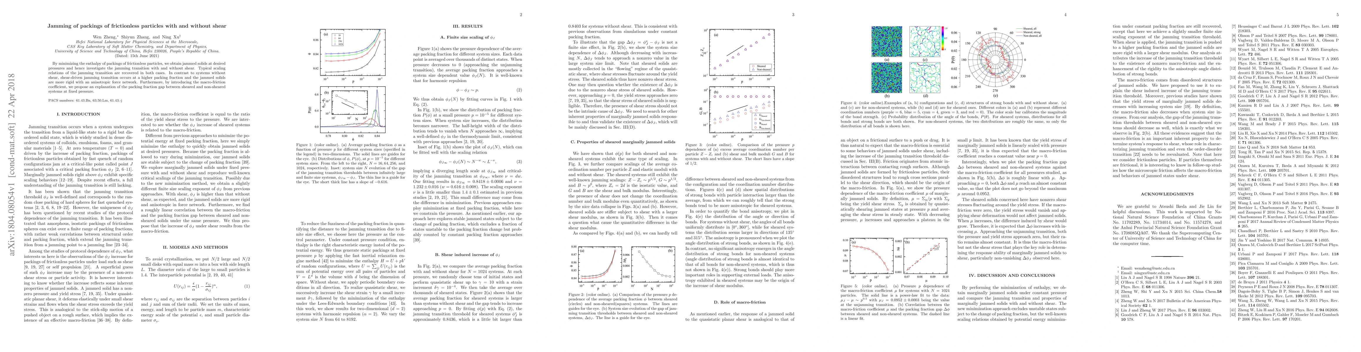 The research minimizes the enthalpy of frictionless particle packings at desired pressures to investigate the jamming transition with and without shear, using fast inertial relaxation engine and Lee-Edwards boundary conditions.