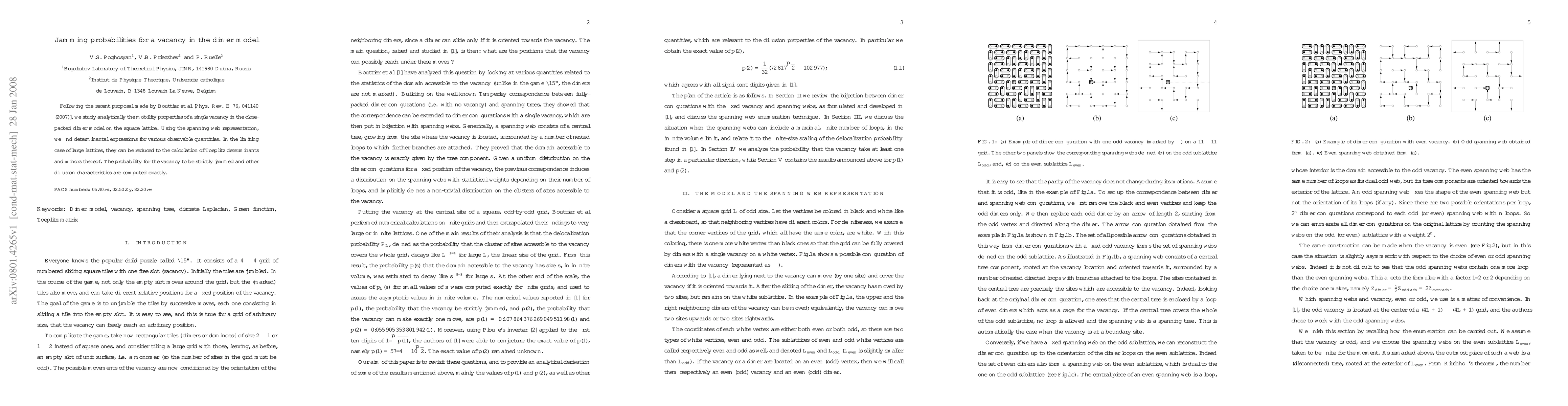 This paper analytically studies a vacancy's mobility in a dimer model on a square lattice, using spanning web representation to derive determinantal expressions for observable quantities. Large lattice limiting case is simplified to Toeplitz determinants, enabling exact calculation of vacancy jamming probability and diffusion characteristics.