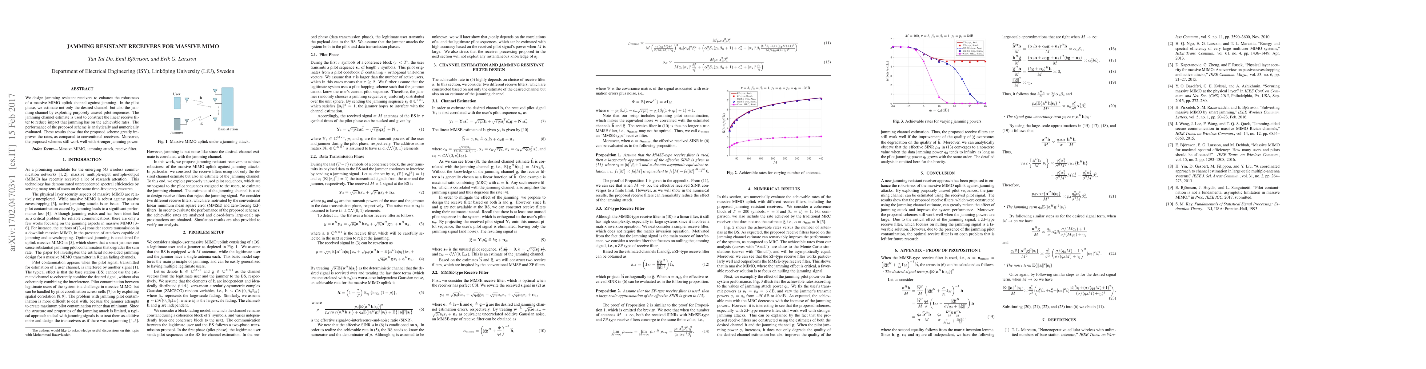 This research introduces jamming resistant receivers for massive MIMO systems, estimating both desired and jamming channels during pilot phases using unused sequences. The receivers effectively reduce jamming impact on data rates, performing well even with stronger jamming power, as demonstrated by analytical and numerical evaluations.