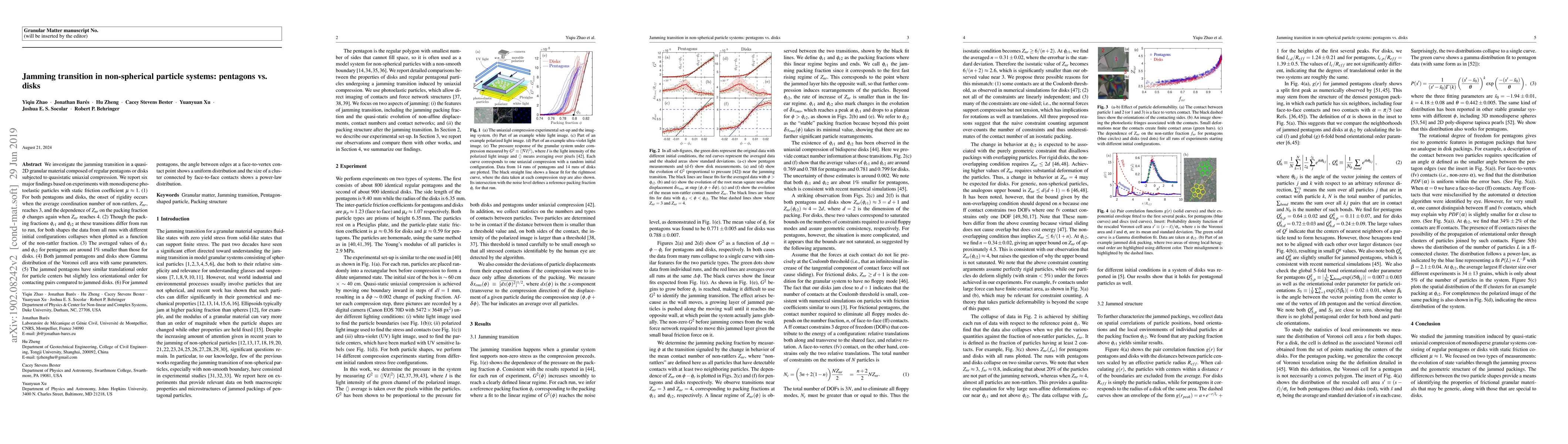 We investigate the jamming transition in a quasi-2D granular material composed of regular pentagons or disks subjected to quasistatic uniaxial compression. We report six major findings based on experiments with monodisperse photoelastic particles with static friction coefficient $\mu\approx 1$. (1) For both pentagons and disks, the onset of rigidity occurs when the average coordination number of non-rattlers, $Z_{nr}$ , reaches 3, and the dependence of $Z_{nr}$ on the packing fraction $\phi$ changes again when $Z_{nr}$ reaches 4. (2) Though the packing fractions $\phi_{c1}$ and $\phi_{c2}$ at these transitions differ from run to run, for both shapes the data from all runs with different initial configurations collapses when plotted as a function of the non-rattler fraction. (3) The averaged values of $\phi_{c1}$ and $\phi_{c2}$ for pentagons are around 1% smaller than those for disks. (4) Both jammed pentagons and disks show Gamma distribution of the Voronoi cell area with same parameters. (5) The jammed pentagons have similar translational order for particle centers but slightly less orientational order for contacting pairs comparing to jammed disks. (6) For jammed pentagons, the angle between edges at a face-to-vertex contact point shows a uniform distribution and the size of a cluster connected by face-to-face contacts shows a power-law distribution.