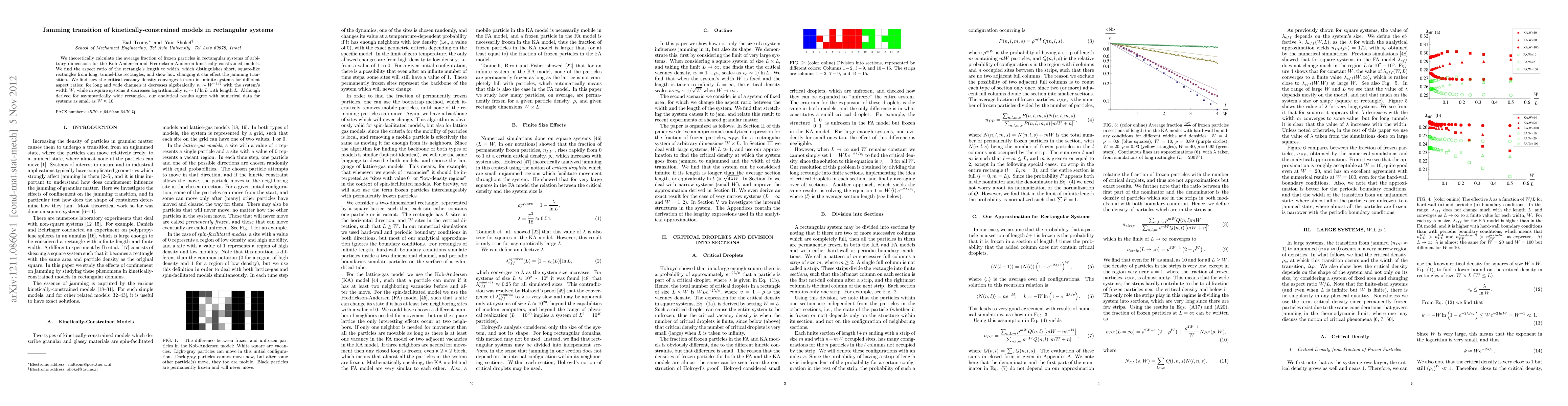 We theoretically calculate the average fraction of frozen particles in rectangular systems of arbitrary dimensions for the Kob-Andersen and Fredrickson-Andersen kinetically-constrained models. We find the aspect ratio of the rectangle's length to width, which distinguishes short, square-like rectangles from long, tunnel-like rectangles, and show how changing it can effect the jamming transition. We find how the critical vacancy density converges to zero in infinite systems for different aspect ratios: for long and wide channels it decreases algebraically $v_{c}\sim W^{-1/2}$ with the system's width W, while in square systems it decreases logarithmically $v_{c}\sim1/\ln L$ with length L. Although derived for asymptotically wide rectangles, our analytical results agree with numerical data for systems as small as $W\approx10$.