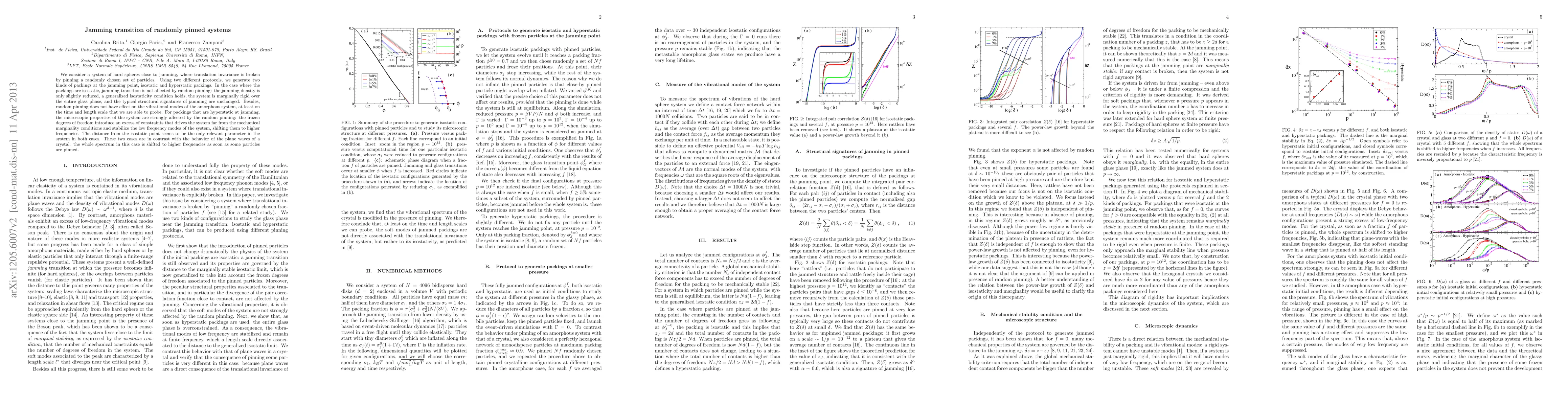 We consider a system of hard spheres close to jamming, where translation invariance is broken by pinning a randomly chosen set of particles. Using two different protocols, we generate two kinds of packings at the jamming point, isostatic and hyperstatic packings. In the case where the packings are isostatic, jamming transition is not affected by random pinning: the jamming density is only slightly reduced, a generalized isostaticity condition holds, the system is marginally rigid over the entire glass phase, and the typical structural signatures of jamming are unchanged. Besides, random pinning does not have effect on the vibrational modes of the amorphous system, at least on the time and length scale that we are able to probe. For packings that are hyperstatic at jamming, the microscopic properties of the system are strongly affected by the random pinning: the frozen degrees of freedom introduce an excess of constraints that drives the system far from the mechanical marginality conditions and stabilize the low frequency modes of the system, shifting them to higher frequencies. The distance from the isostatic point seems to be the only relevant parameter in the system in both cases. These two cases are in contrast with the behavior of the plane waves of a crystal: the whole spectrum in this case is shifted to higher frequencies as soon as some particles are pinned.
