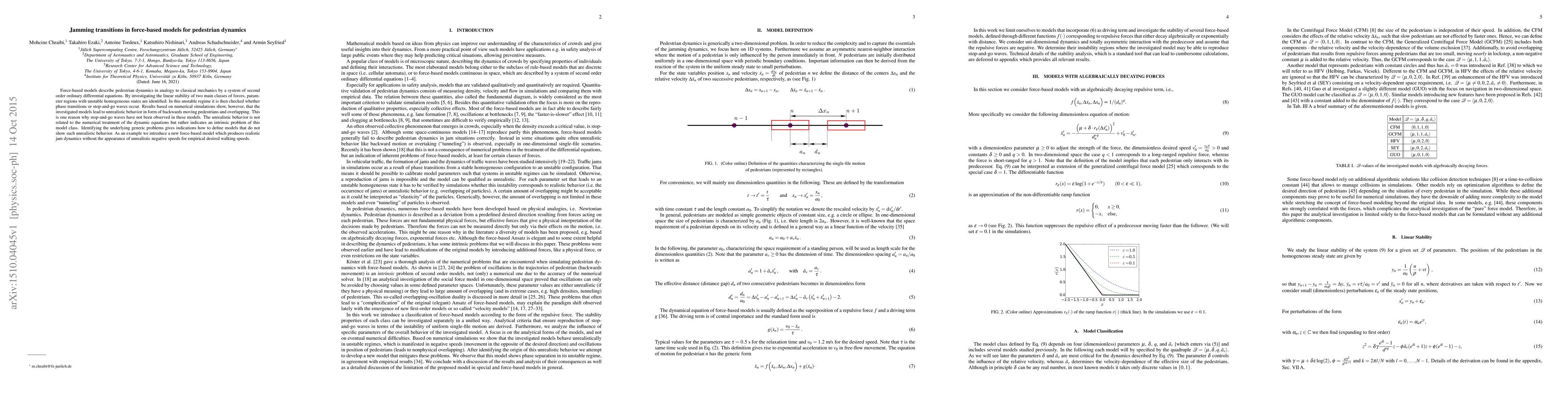 This paper investigates the stability and dynamics of force-based models for pedestrian movement, identifying intrinsic flaws leading to unrealistic backward movement and overlap. It proposes a new model that avoids these issues and produces realistic jam dynamics.