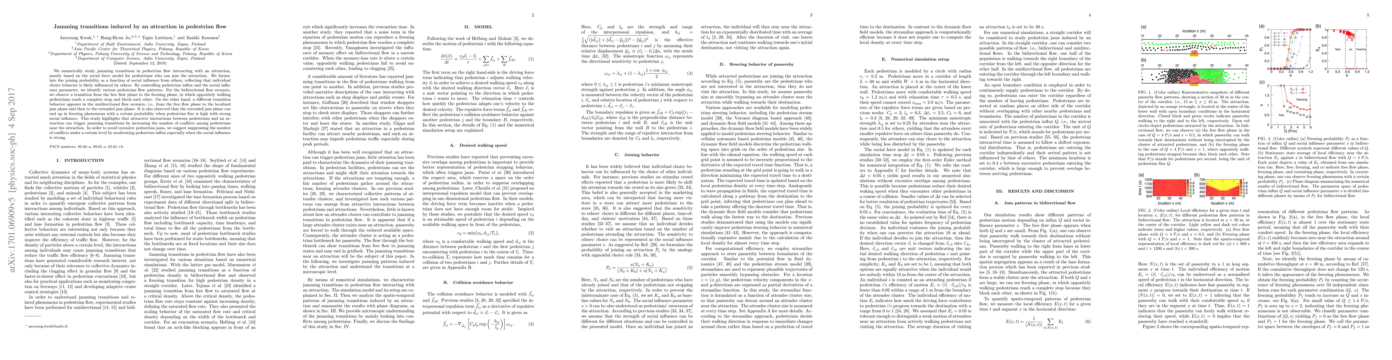 We numerically study jamming transitions in pedestrian flow interacting with an attraction, mostly based on the social force model for pedestrians who can join the attraction. We formulate the joining probability as a function of social influence from others, reflecting that individual choice behavior is likely influenced by others. By controlling pedestrian influx and the social influence parameter, we identify various pedestrian flow patterns. For the bidirectional flow scenario, we observe a transition from the free flow phase to the freezing phase, in which oppositely walking pedestrians reach a complete stop and block each other. On the other hand, a different transition behavior appears in the unidirectional flow scenario, i.e., from the free flow phase to the localized jam phase and then to the extended jam phase. It is also observed that the extended jam phase can end up in freezing phenomena with a certain probability when pedestrian flux is high with strong social influence. This study highlights that attractive interactions between pedestrians and an attraction can trigger jamming transitions by increasing the number of conflicts among pedestrians near the attraction. In order to avoid excessive pedestrian jams, we suggest suppressing the number of conflicts under a certain level by moderating pedestrian influx especially when the social influence is strong.