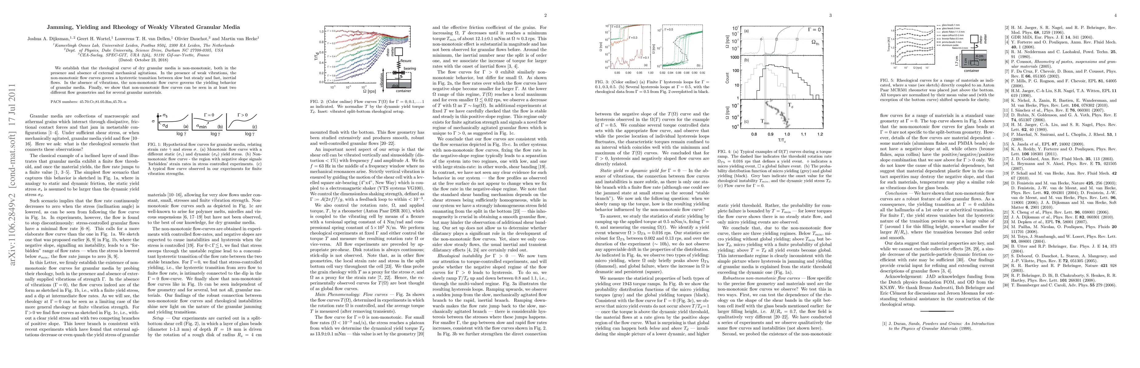 This study reveals that the rheological behavior of dry granular media is non-monotonic, leading to hysteretic transitions between different flow regimes under weak vibrations and yielding behavior without vibrations. The findings apply across various granular materials and flow geometries.