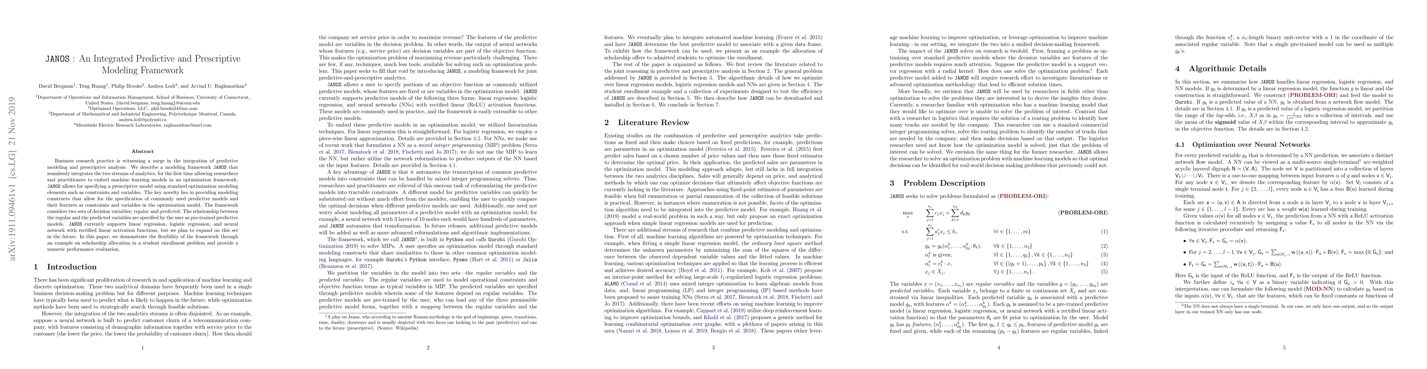 The paper introduces JANOS, an integrated predictive and prescriptive modeling framework that allows embedding machine learning models in an optimization framework. It supports linear regression, logistic regression, and neural networks with rectified linear activation functions.